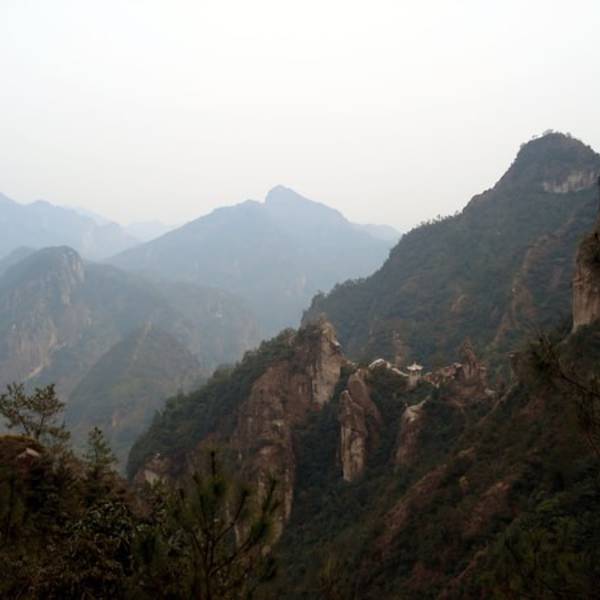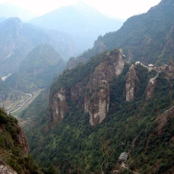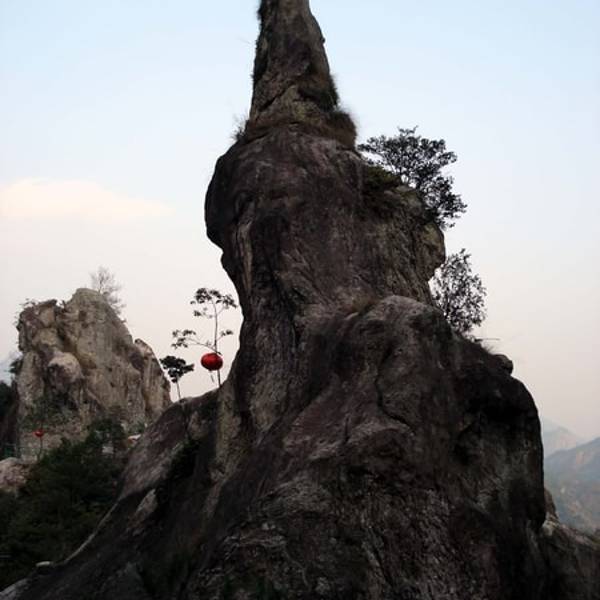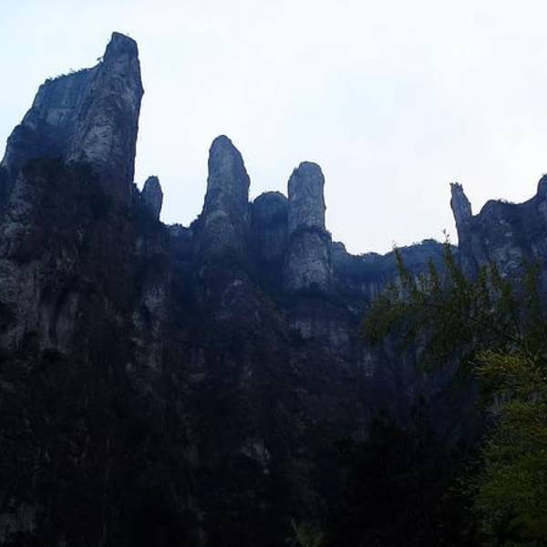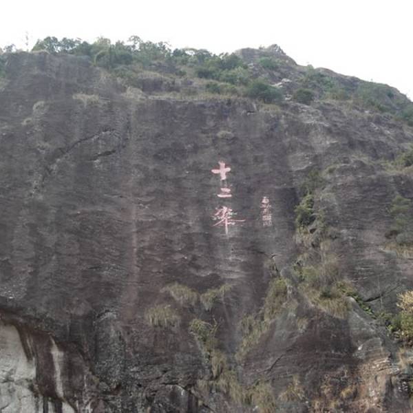 十二峰位于大若岩景区,离陶公洞约2公里。是一组流纹岩因节理风化和流水侵蚀,地壳抬升而成的峰群。它们千姿百态,各有所似,形象逼真,移步换形。人们为之取名曰宝冠峰、香炉峰、仙掌峰、天柱峰、莲花峰、展旗峰、石笋峰、横琴峰、卓笔峰、犀角峰、石碑峰、童子峰。十二峰峰峦高耸,峰顶常有云雾笼罩,若隐若同,扑朔迷离,是大自然馈赠楠溪江的魂宝。最高峰为宝冠峰,海拔517米。天柱峰犹如一柱擎天,自山腰拔地而起,相对高度约250米,甚为壮观。