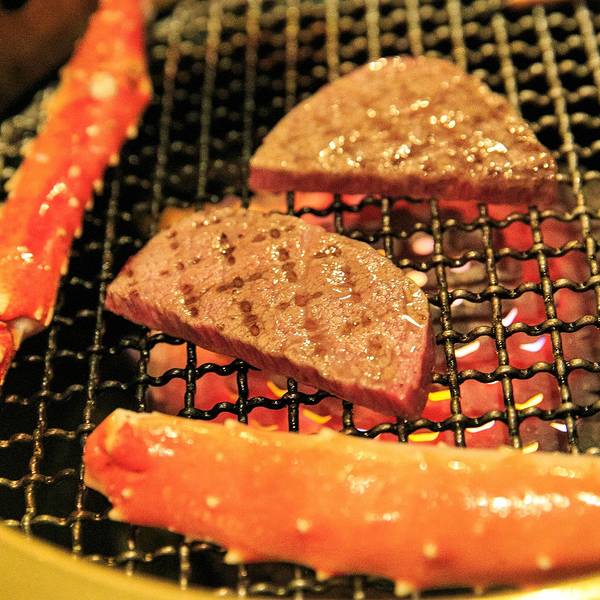 六歌仙烤肉在各大旅游网站人气很旺,虽然营业到凌晨四点,但一直非常火爆,据说直接来是很可能没有位置的,所以最好提前预订。这里楼层较高用餐时还可以欣赏到新宿夜景~ 六歌仙有各种档次的放题自助,也有很多种类的套餐可以选择。这么晚了不想吃的太撑,所以我俩想问问可不可以点一个套餐share一下,但和服务员没沟通明白,最后给我俩一人上了一套,撑死的同时也十分肉疼。。。我们点的是16000日元左右的吉祥之宴套餐,烤品包括松坂牛肉在内的三种烤肉以及帝王蟹,内容十分丰富。下图是部分开胃小菜和清酒,应该是都可以再续的。最后看了账单的我早知道就喝个痛快了。。先上了厚切的牛舌,调味简单,但真的超级好吃,口感Q弹还有肉汁,要不是最后太饱很想再多点一份。这款肉肉虽然油花不多,但分布均匀,肉质极嫩筷子轻轻一夹就断,吃起来油脂和肉汁结合起来口感很嫩又不会太腻。帝王蟹,已经煮熟了,简单烤烤就能吃。肉质紧实甘甜,但和油滋滋的烤肉比起来显得有点轻淡了。最重头的松坂牛肉!!一块只用盐来调味,一块酱汁调味。松坂牛肉的油脂非常丰富,看起来很漂亮,但吃起来可想而知会有点腻。果然一吃入口即化,满口油脂的香气,但吃多了会腻到不行,感觉男生会比较喜欢这种口感。除了烤肉,还有多种主食可以选择。最后一份冰淇凌结束完美的一餐,顺便解解腻~六歌仙烤肉 地址:东京都新宿区西新宿1-3-1 太阳花大厦6F/7F(大铁桥十字路口) 营业时间: 周一至周日 11:00至次日5:00营业,全年无休。 花费:人均16000日元,自助有从7000日元到28000日元不等的多种选择。 环境:★★★☆☆ 因为人气旺所以客人非常多,所以环境很嘈杂。不同桌有隔板这点蛮好,看不到隔壁。 口味:★★★★★ 每款烤肉都非常美味,套餐的分量也很足,配菜也很用心。 推荐:★★★★☆ 东京的烤肉店太多了,这家店绝对不能说是最好的,但从各方综合来看还是值得一试的。