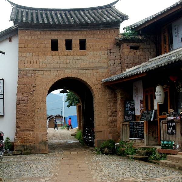 东寨门被村民称为“街子门”,这寨门用土坯镶砌而成,仅容两匹马同时通过,保留了茶马古道上的寨门原有的样子。古镇原有东、南、北三个寨门,其中的东寨门通往大理,北寨门通往西藏,南寨门则通往沙溪南面的各个盐井,如今只有东寨门保存完好,北寨门早已无存,南寨门则刚刚重建完成。东寨门由泥砖建成,按原样修复的造价远高于用现代材料重建,但本着修旧如旧的原则,沙溪复兴工程仍忠实地遵循古老的工艺,维修以加固为主尽量不改变建筑结构,连脱落的墙皮都照维修前的样子恢复
