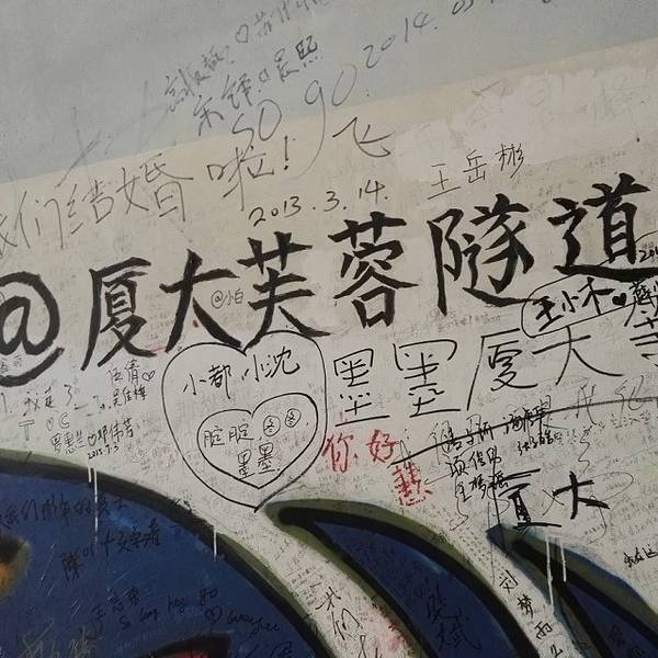实用 而且虽然游客很多,但还是可以看到风一般驶过的自行车流,这也未尝不是一种风景芙蓉隧道在厦门大学校内,来厦门旅游的朋友一般都会来厦大看看,毕竟厦大是中国十大最美大学之一。芙蓉隧道是厦大比较有特色的一个看点,是很多厦大学子的彩色涂鸦,看看厦大学子的风采。墙上有各种各样的内容,...芙蓉隧道在厦门大学校内,来厦门旅游的朋友一般都会来厦大看看,毕竟厦大是中国十大最美大学之一。芙蓉隧道是厦大比较有特色的一个看点,是很多厦大学子的彩色涂鸦,看看厦大学子的风采。墙上有各种各样的内容,有些让你捧腹大笑,有的让你感慨万千,有的让你哭笑不得。其中也不乏一些游客在墙上留下自己的足迹,或者记录自己的爱情,或者发表一些感叹。这条隧道挺黑的,但足以看清墙面上的涂鸦,或许朦胧才是这条隧道的魅力吧。隧道中间处还有一家小店卖纪念品明信片等小东西的,也可以进去逛逛。穿梭于此有种穿越时光隧道的感觉,看着墙上别人的爱情历程就像在体验别人的人生一样,或羡慕或感动。而且虽然游客很多,但还是可以看到风一般驶过的自行车流,这也未尝不是一种风景。 展开