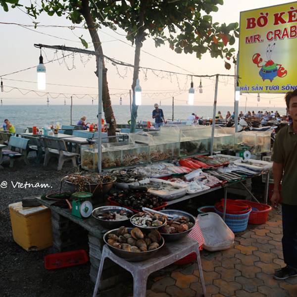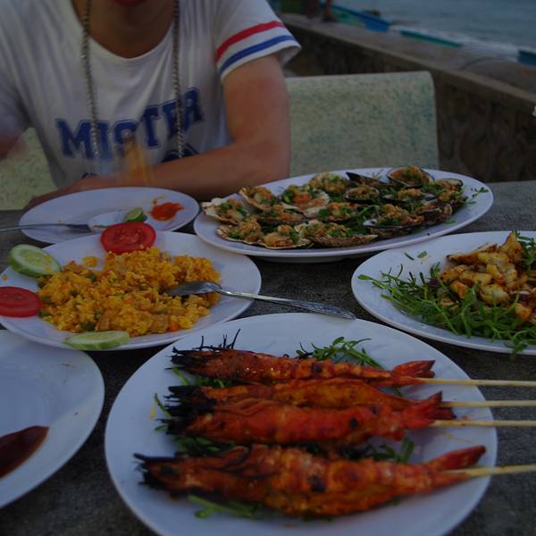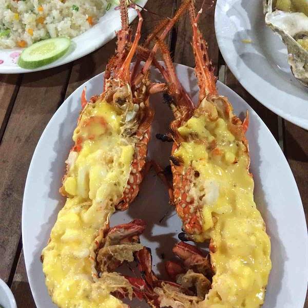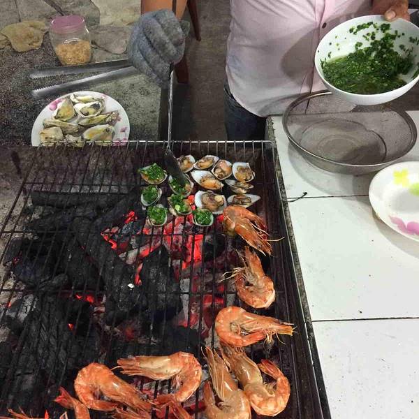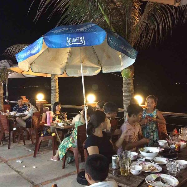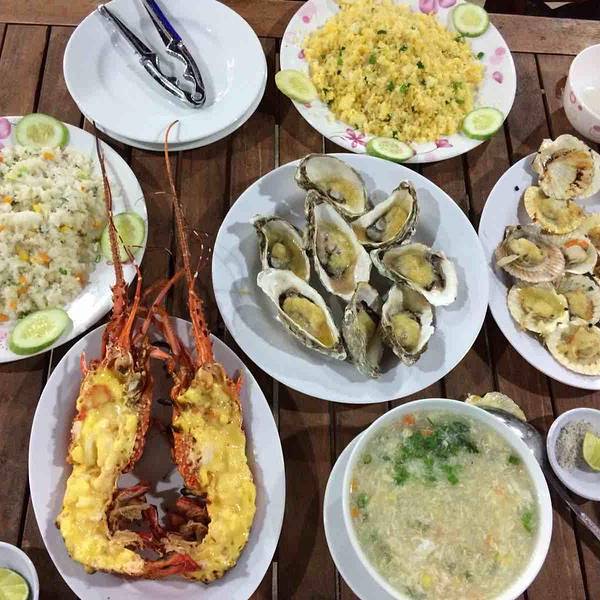 到了汽车站下了汽车很饿,走不远看到这家海鲜馆不是那种外面有人拉客的那种,因为客人很多,店员都很忙!进去看当地人很多!长时间的旅行经验是吃饭找人多的,当地人多就更好了!店面靠海,一边吃一边听海浪的声音!价格真是实惠,四只大虾13万越南盾,烤鱿鱼五万越南盾,一盘贝壳4万越南盾!一顿海鲜餐下来才100多点人民币!结果转天又去吃了!龙虾100万越南盾1公斤,生蚝1万越南盾一只!唯一不足的是都是西式风味奶酪蒜香的!如果不喜欢要提前说清楚烹调方法!