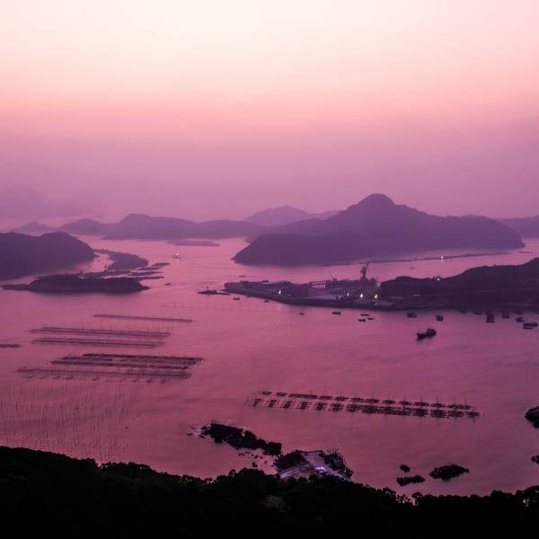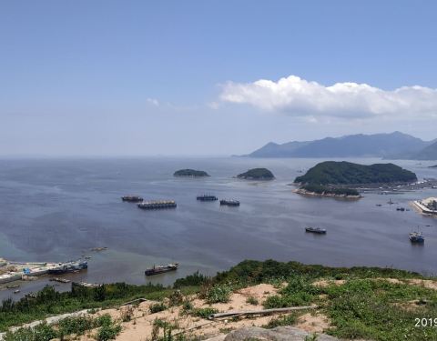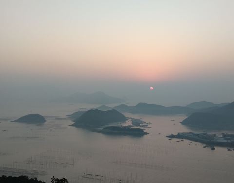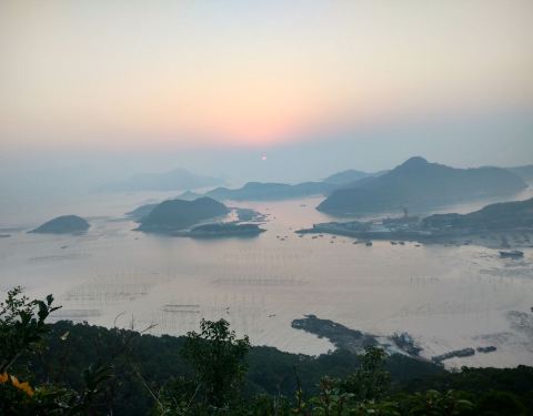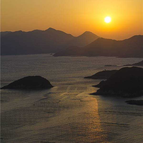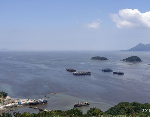 在这里居高临下,鸟瞰大海,水天相连,海面上大小岛屿星罗棋布。在紫莱种养获收季节,当一轮红日从海面冉冉升起,火红的海面霞光辅展,水面波光鳞鳞,渔民架着小木船在浮标竿影间穿梭劳作,构成一幅天然秀美的山水画卷。