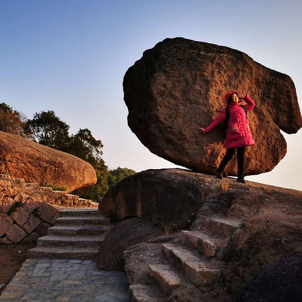 凌晨四点起床,从酒店开四十分钟车穿三沙镇而过后,在路边国家电网的岔路上向北盘山而上,在乡间小路上一块《花竹等村景点分布图》的牌子处,有一条小路向山坡下翻去,即可见一条小路在乱石堆中蜿蜒,向下直到半山腰一块巨石上。