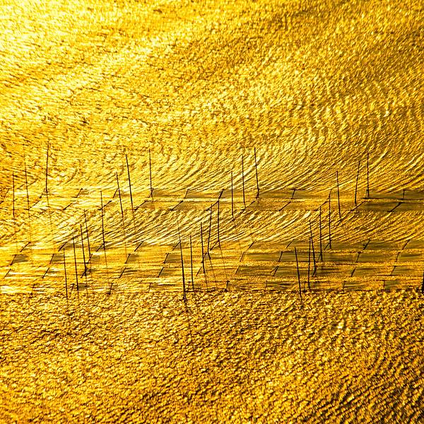 近景浮标竹竿、中景鱼排木屋、远景岛屿帆影。