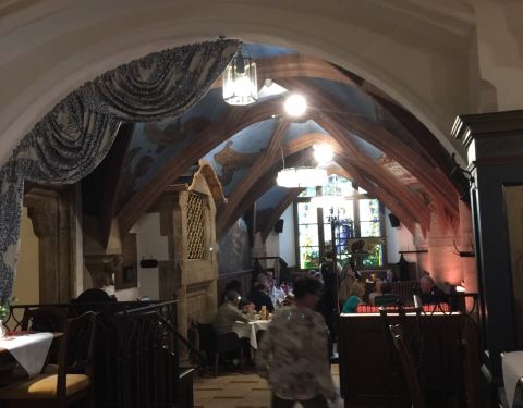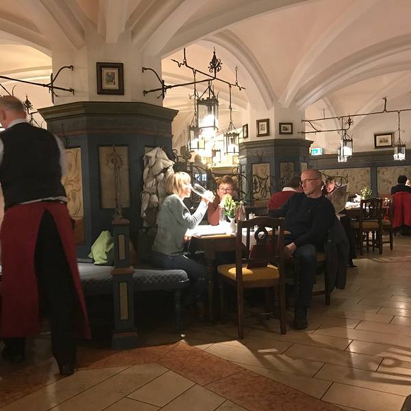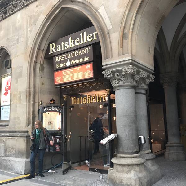 每一个有Rathaus(City Hall)的德国城市必定会有一家市政厅酒窖餐厅Ratskeller。而位于宏伟的哥特式建筑之下的这间慕尼黑Ratskeller也是慕尼黑游客必去的餐厅之一。它的两个入口都隐藏在新市政厅东南角的两侧,...每一个有Rathaus(City Hall)的德国城市必定会有一家市政厅酒窖餐厅Ratskeller。而位于宏伟的哥特式建筑之下的这间慕尼黑Ratskeller也是慕尼黑游客必去的餐厅之一。它的两个入口都隐藏在新市政厅东南角的两侧,向地下引去。石砖门充满神秘感,门口便有菜单供游客参考。进入餐厅内部,其实面积蛮大,而且有装饰风格不同的房间可以用餐,聚会,甚至举行小型庆典。