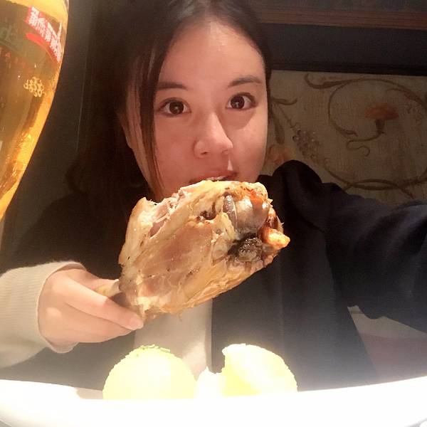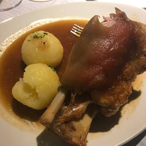 价格有点贵,一共26欧左右, 啤酒点了一份for lady。上菜的时候还是被这个猪肘吓了一跳,足足有脸盘这个大的一个蹄髈。啃了第一口,非常好吃,外焦里嫩,皮也毫不油腻。