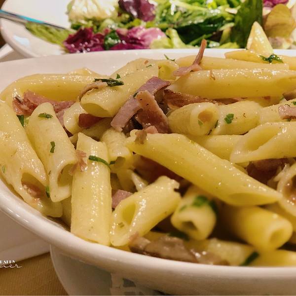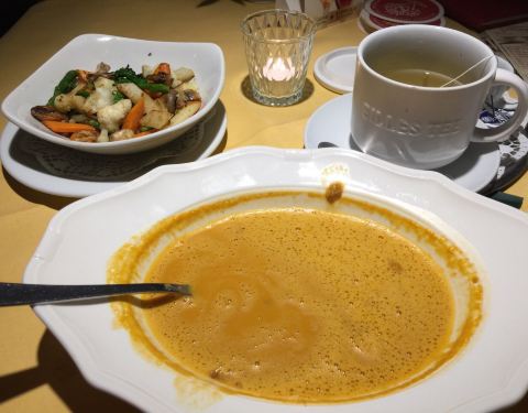 别看店是在地底下的,装修可别致了。座位之间的隔档被设计成了衣帽架,实用又好看。为我们服务的是一位老奶奶,点菜的时候一切顺利,我们高兴的觉得奶奶英文不错。可是用完主食让奶奶上甜点的时候真是花了老力气了,才发现奶奶根本不会说英文啊,但她依然非常执著又耐心地跟我们说德语…阿门,以为说慢一点就能听懂的这毛病看来不止日本有,你有我有大家有啊!最后奶奶叫来了一个同事帮忙终于还是说清楚了。谢天谢地。想说补充点维生素就点了草来吃。其实如果点主食像意大利面之类的,千万不要再点色拉了,因为配菜通才会给你一盆草的。诺,意面后面那盆就是送的草啊。以及菜量很大,千万不要一人一份主食,完全吃不完。我们坎坷的甜品。焦糖布丁口感更像炖蛋~