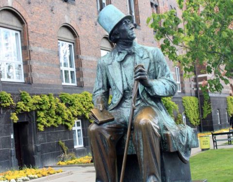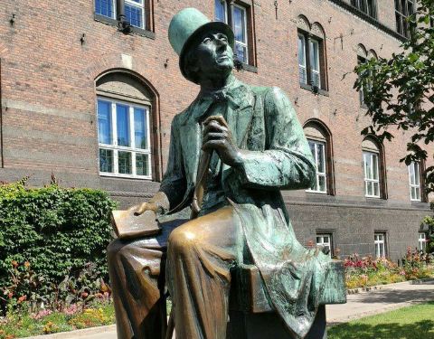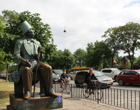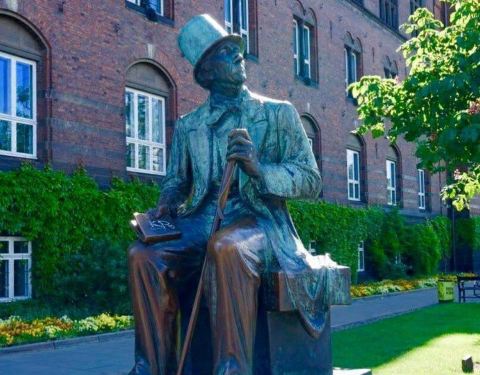 来到丹麦首都哥本哈根,人们总会想到去看一下小美人鱼铜像。而位于哥本哈根市政厅旁边的角落,也有一座穿西装长袍、戴礼帽的先生的铜塑雕像,他就是大名鼎鼎的童话作家安徒生——小美人鱼的故事《海的女儿》的创作者。安徒生1805年出生于丹麦,一生写过《海的女儿》、《卖火柴的女孩》、《丑小鸭》等150篇不朽童话故事,为世界上千万儿童编织了美丽的童年,被誉为“现代童话之父”。 这尊约3米高的安徒生雕像座落在人潮熙攘的大街旁,安徒生穿着西装长袍,戴着礼帽,嘴角微微带着笑意,向左仰头望着天空。塑像背后就是哥本哈根市政厅,马路对面不远处则是趣伏里公园。每天都有不少路过的游客会抬起头瞻仰大师的面容,或与其拍照留念。