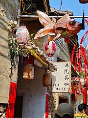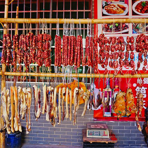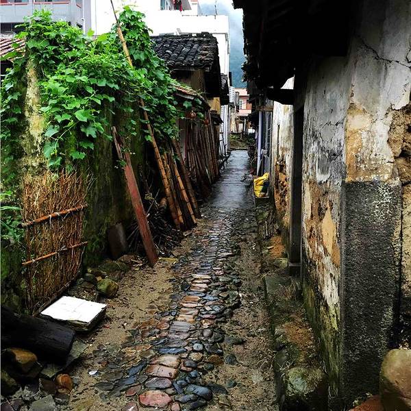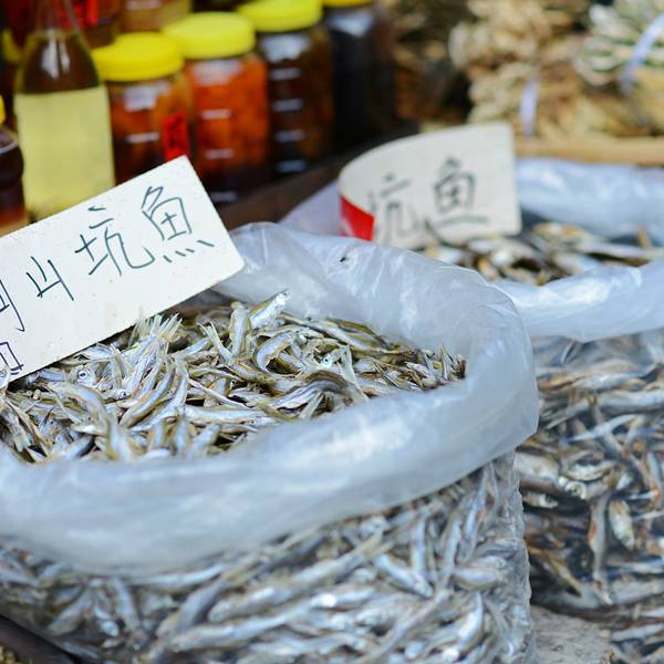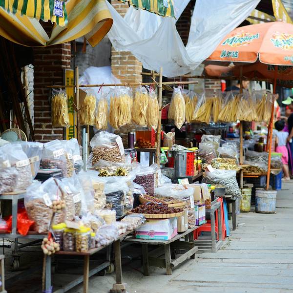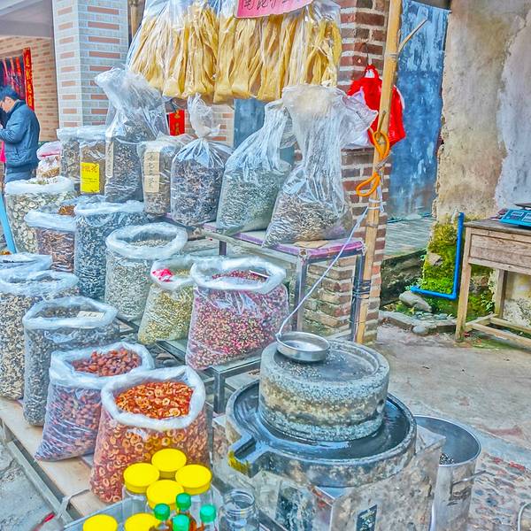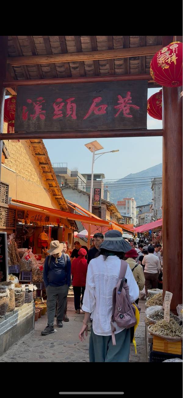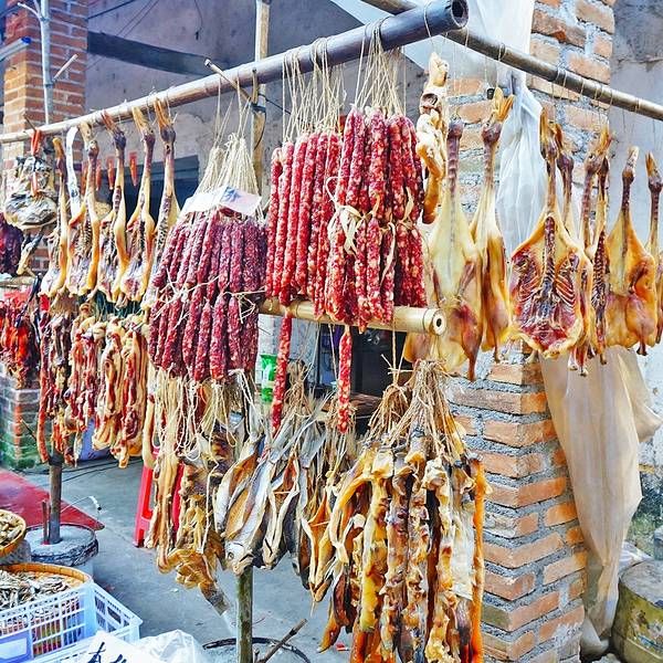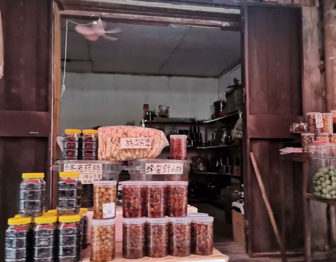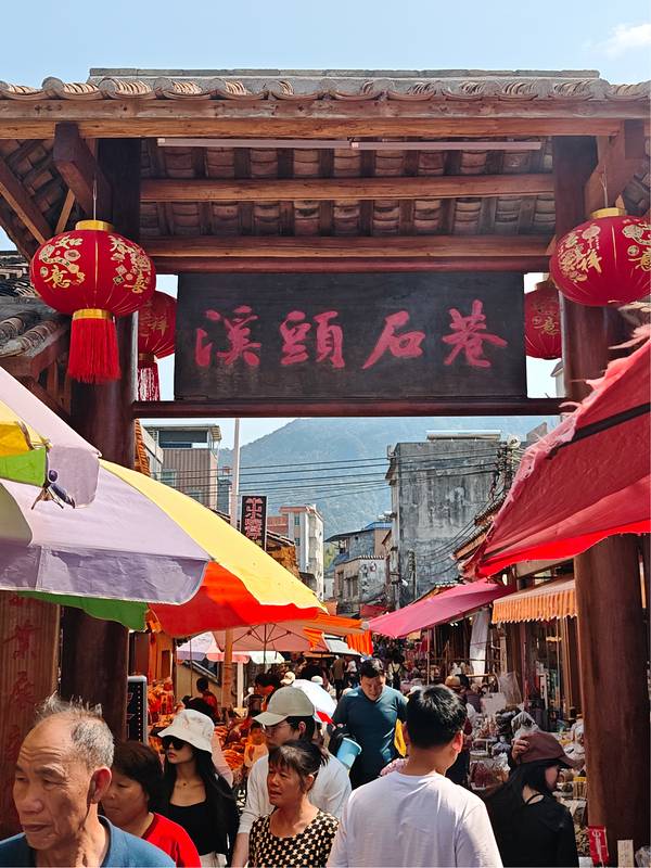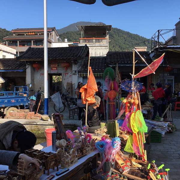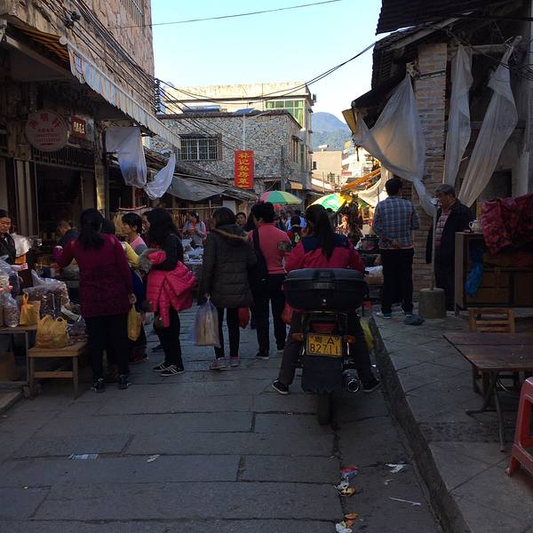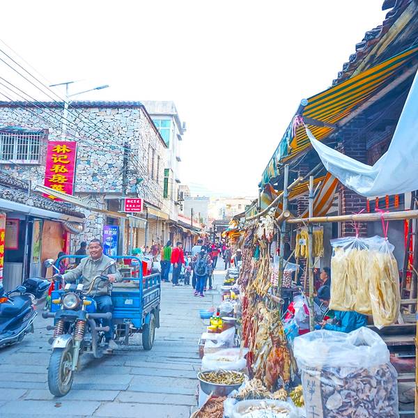 进入溪头村的牌坊,一条约2米宽的小路,基本没有支路,一直到尽头两边都是摆满各种货品,跟大致到旅游区都有点相似,街道两旁一栋栋到小房子显然有些年纪了,而居住到基本都是这里长大到居民。看到最多的是腊肉腊肠和鱼干,所谓秋风起晒腊味,广东人多都会有这喜好,一阵风吹过,也还真香。