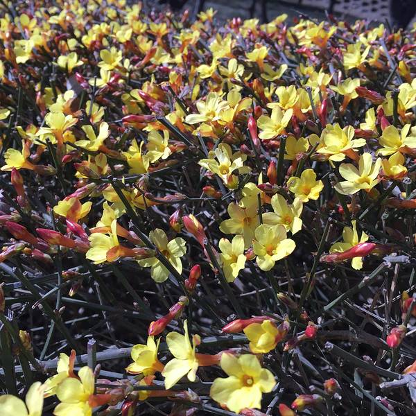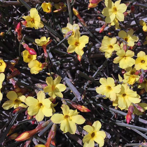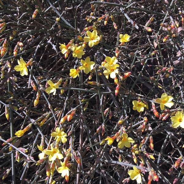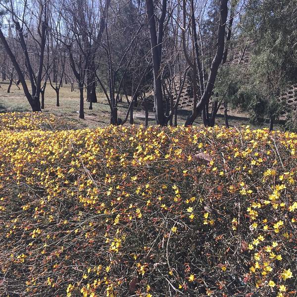今年2月28日海淀区万泉河桥附近的迎春花开,迎春花与连翘长得比较像,迎春花开得早一些,是6瓣,树枝一般冲下,连翘是4瓣十字花型,树枝冲上,一般是一株株的生长。