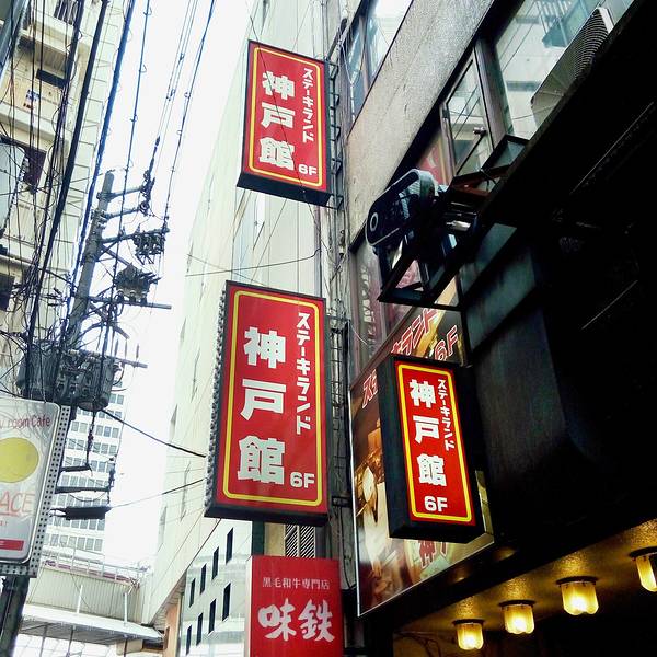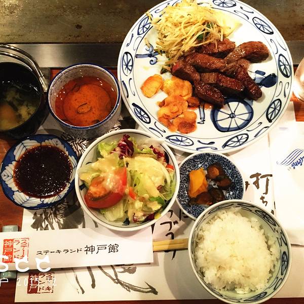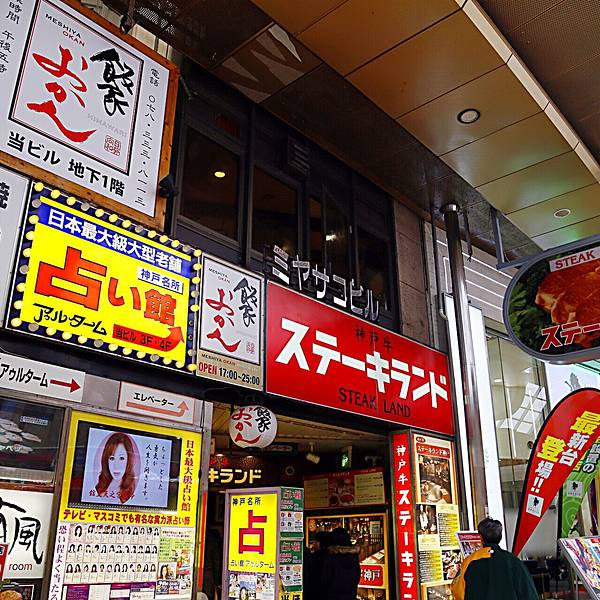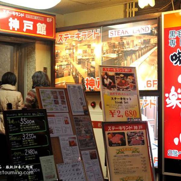 这一路我们都没太早起过。不过日本的宾馆大都不是中午12点退房,而是上午9-10点退房。如果不是这样的制度也许我们会浪费一个又一个上午。 写到这里已经是此行的最后一天了,我们来神户的另一个重要目的就是要品尝神户牛的。 千挑万选之后我们来到了这家ステ-キ ランド(steakland),性价比很高,尤其午市。我们非常明智的10点多就来排队了,这样11点刚过就有座位了,赶上了午市第一批的神户牛。 下图红色牌子就是他家,就在三ノ宫那里,我们也住那附近。