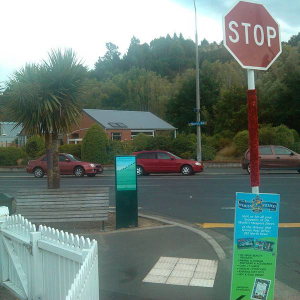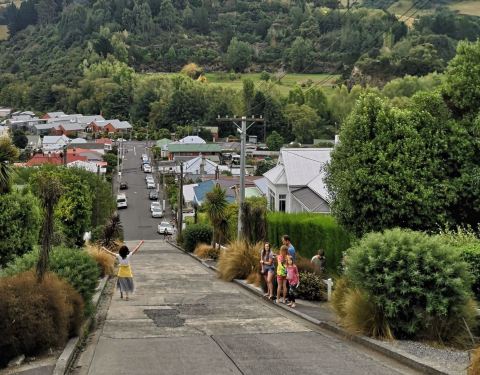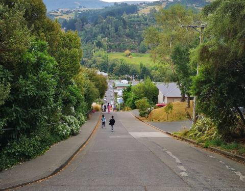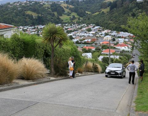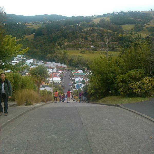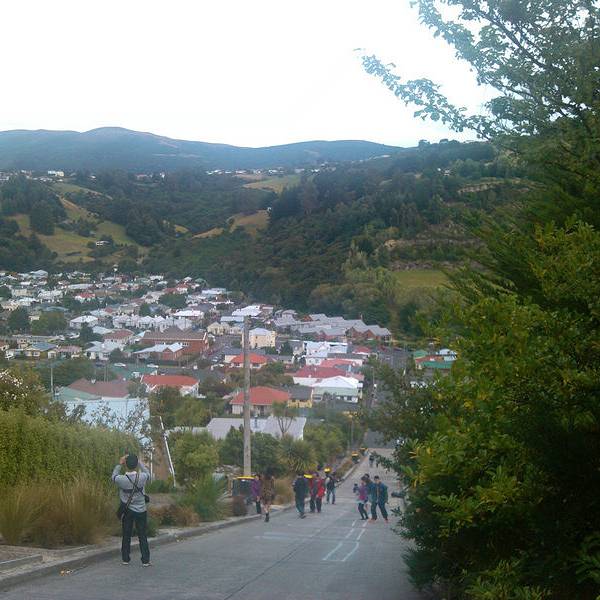 也没想到在南半球南岛最南边的城市市郊那么偏远的地方,有条街会吸引这么多目光,甚至排在人气榜首位,而原因竟然是它的坡度。此街不长,仅300多米,站在山下就能够看到头,头100米比较平缓,后面的坡度让人惊叹,感觉还不止平均的35%坡度。 其实坡不高,路旁还设有台阶,人步行上去并不辛苦。关键是马路陡,在这里开车应该比走路更辛苦。路两旁的建筑与马路几乎成四十五度斜角,而很多人喜欢把相机弄成与路面平行的角度来拍房子,就好像房子建歪了似的,非常有创意。 我们乘旅游大巴前来,当然没机会像自驾客那么疯狂来挑战斜坡起步和倒溜了。来这里观摩的游客很多,挑战者真的得小心一些。 好不容易爬上坡顶,还以为能在优雅的环境中休息一下,可虽然旁边有张长木椅子,但周边垃圾很多,完全败坏了新西兰纯净的形象。或许是来的游客太多,带来了垃圾。 从山顶往坡下看,道路就好像一个滑梯,如果坐滑板或骑自行车溜下去,一定很刺激。新西兰城市没有什么高楼,主要都是一两层的别墅,在这个制高点看到很漂亮的小镇景色和对面树木葱茏的青山。 在坡底的小商店,有售卖类似挑战成功的纪念品,但又有什么能证明,你有登上过坡顶呢? 【交通指引】 位于但尼丁市东北郊,自驾车能轻松到达,而在八角广场可以乘坐9路巴士前往。 【游玩时间】 此街全长约400米,步行往返还有点吃力,加上照相,基本需要半小时。请尽量保持清洁,毕竟这里是当地人生活的社区,不是有人管理的旅游景点。