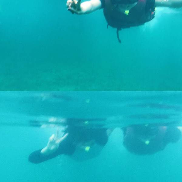 海洋公园的水很清澈,各种热带生物色彩斑斓...我们在楼下集合,跟着教练走到拉古娜码头,坐船大约10分钟左右就开到了海洋公园。教练叽叽呱呱说了一通(其实我们没有听懂,到底是何方语言咧?),大家便向大海冲去!