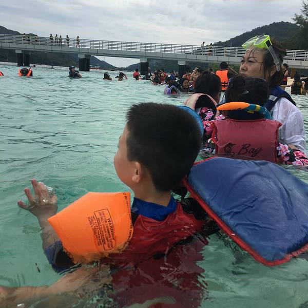 海洋公园下船后可以到栈桥的右边浮潜,那边的景色较好,左边的东西较少,并且在栈桥右边下水时有专人帮忙水下拍照,5rm一张上岸后可挑选喜欢的照片。