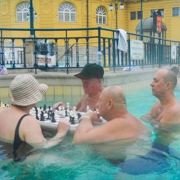 十一月的布达佩斯气温极低,穿着泳衣跑入温泉区感受非一般的冰火两重天。白天的塞切尼就如同一个贵族聚集的庞大宫殿,人们在这里欢歌,游水,嬉闹,下棋,拥抱,亲吻,一片美好。泉水是蓝绿色,清澈而温暖,不会烫灼皮肤,却令人怡然自得。夜幕降临,暖黄色的灯光亮起,这里变成了一个神秘的魔法学校,浴池里持续地冒着浅白色的水蒸气,浴场变得安静而深邃,分不清是在人间还是天堂,忘记了时间和四季,深蓝色做背景的夜衬出了塞切尼高贵又骄傲的美丽,守护着每一个浴场的人。