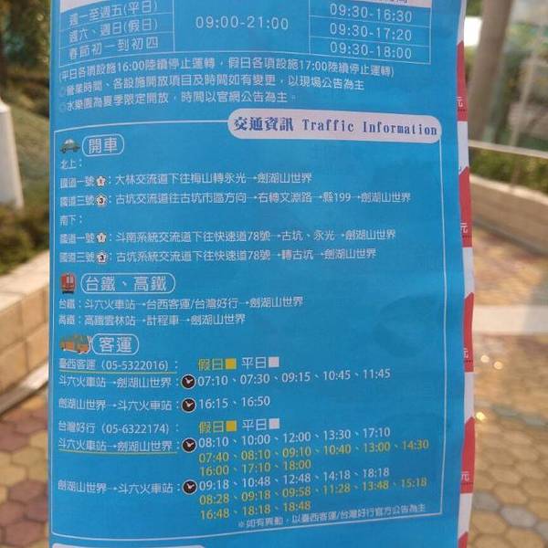 16:50到外面马路上搭台西客运班车44台币一人回斗六火车站开半小时。(刚好我就是带1米高孩子,上午有事没赶上班车,打车350台币过来,下午1点来到剑湖山大门,孩子1米以下可以免票,全价899台币1点后入内只要450,当月寿星只要100块!(刚好我就是!于是我们一家三口花了550就进入了),大概有6个...带1米高孩子,上午有事没赶上班车,打车350台币过来,下午1点来到剑湖山大门,孩子1米以下可以免票,全价899台币1点后入内只要450,当月寿星只要100块!(刚好我就是!于是我们一家三口花了550就进入了),大概有6个项目适合1米小孩玩,都玩到了。惊吓列车和5D电影也可以玩但是孩子害怕就没玩。13:30看了彩虹剧场演出,比较普通,大型游乐设施都是不再收费可以多次玩的,平日去基本不用排队,16点后各项目陆续结束运营。儿童玩国里玩抓娃娃、摇阿摇等花了200台币左右。16:50到外面马路上搭台西客运班车44台币一人回斗六火车站开半小时。 展开