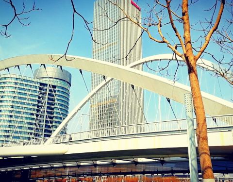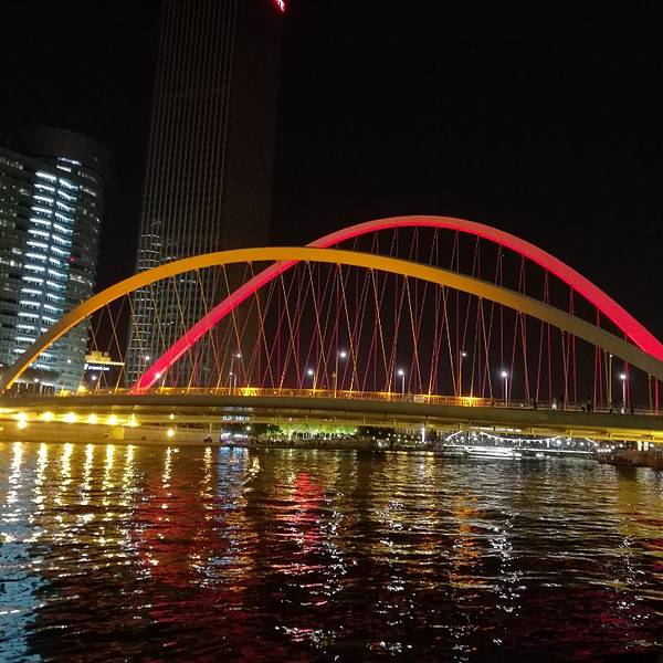 大沽桥位于解放桥和北安桥之间,一般是在逛海河时顺道游览的。大沽桥最美的时候就是傍晚和夜晚。公交车5路大沽桥位于天津市和平区、河北区交界处的海河上,连接河北区五经路与和平区大沽北路。桥梁全长154米,为双向六车道,桥上人行道宽4米。大沽桥位于解放桥和北安桥之间,一般是在逛海河时顺道游览的。或者乘坐海河...大沽桥位于天津市和平区、河北区交界处的海河上,连接河北区五经路与和平区大沽北路。桥梁全长154米,为双向六车道,桥上人行道宽4米。大沽桥位于解放桥和北安桥之间,一般是在逛海河时顺道游览的。或者乘坐海河游船时也会经过大沽桥,导游都会特别讲解一下。公交车5路;901路在大沽桥都有站,下车就到桥下。或者乘坐地铁三号线到天津站下车,从海河东路走过来也不远。大沽桥建于2004年,值得骄傲的是大沽桥曾获得全球桥梁设计建造最高奖——尤金•菲戈奖。桥身一个黄色一个红色的拱圈向外翻转,外形如同日月同辉,结构虽然不对称,但自然美观,在世界上也是独一无二的。大沽桥最美的时候就是傍晚和夜晚。夕阳西下,给大桥涂上一层金色,拱圈连接着一根根拉杆,如同一架巨大的竖琴,弹奏出海河最美的乐章。晚上灯起来后,两个拱圈见光不见灯,一红一黄相遇成趣,在水中投下倒影,非常漂亮。 展开