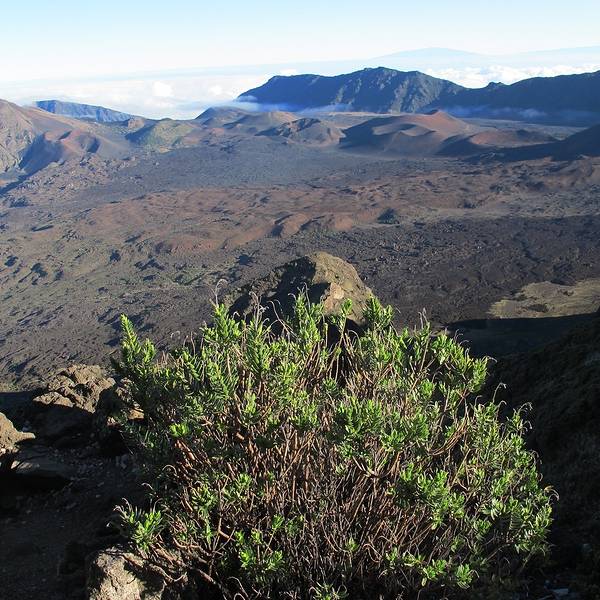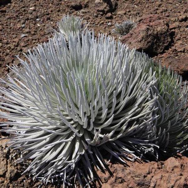说起银剑,这是一种只在Haleakala 火山口生长的植物。银箭生命力强盛,白天须接受烈日高照的考验,晚间则在摄氏零下低温中,与大自然相对抗,即使如此,它的寿命仍然长达二十年之久。成熟后,花茎上长出数以百计的紫色花朵组成的花梗,魅力非凡,花谢后银剑便会枯萎死亡。这是来到Haleakala必定要去观摩的一种神奇植物