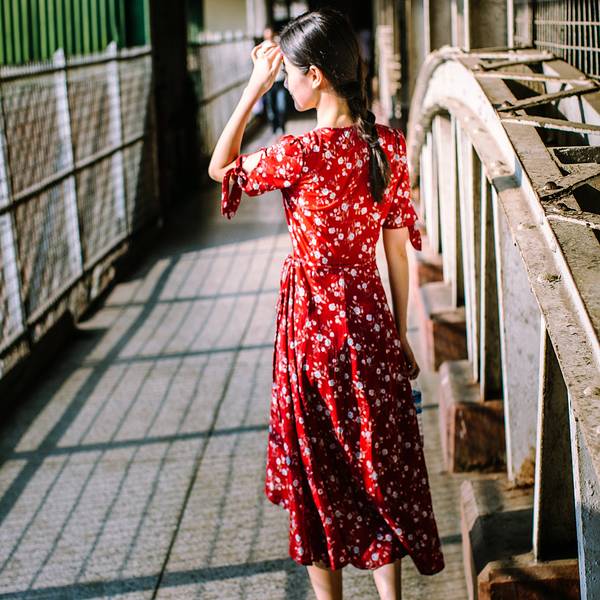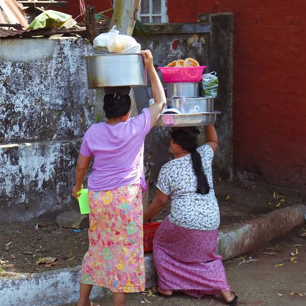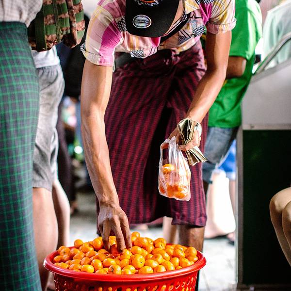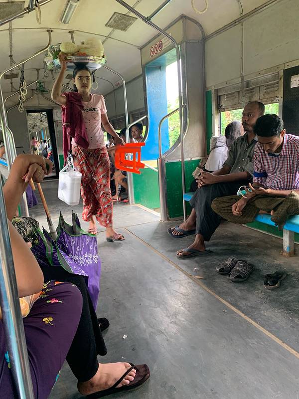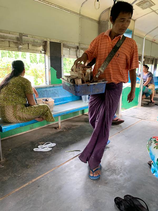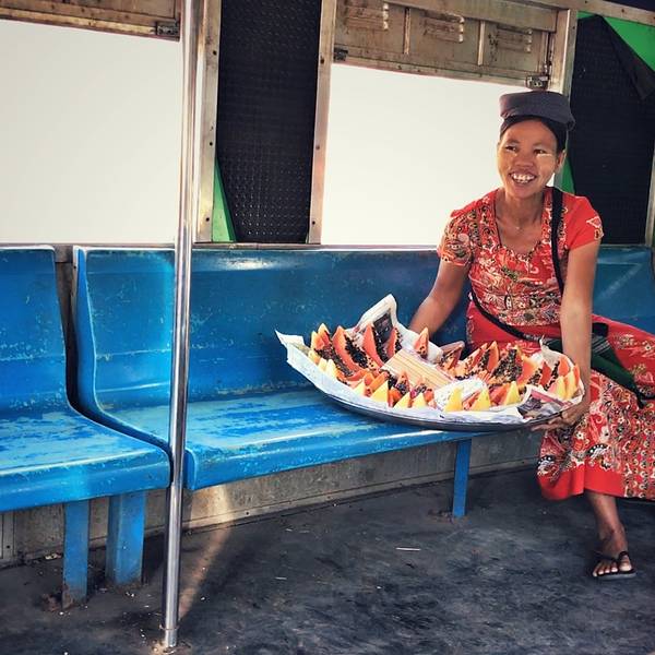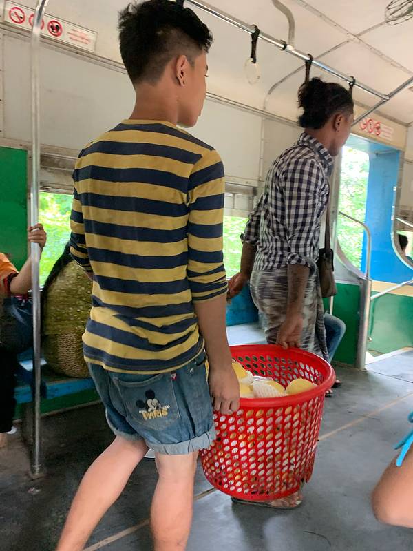 中央火车站很有历史感,像是民国时期的建筑风格。这里并不是热门旅游地点,车站里也大多是当地人。一路问过几个热心的工作人员,恰好赶上了正要发车的一班。环城火车最大的特点就是“慢”。最快的时候时速大约也就是30公里。每节车厢都没有车门,经常看到当地人在火车还没到站时突然跳下车。每个站上车的人都不太多,车厢里却热闹非凡,很少见有一直玩手机的低头族,说笑声、叫卖声、火车“哐当”声交织成交响曲。车门很窄,有高高的台阶。这个狭窄的空间里浓缩了当地人最真实的生活姿态,燥热拥挤,却又生气蓬勃。每到大一点的站台,售卖各种商品的小贩就扛着篮子或竹筐上车,如同浓缩的移动市场。头顶竹篮的大姐和端着铁盘的大叔卖着缅甸人最爱的炸物,还有木瓜和芒果,厚厚蘸上一层辣椒粉或者香料拌一拌,如同这天气一样热烈浓厚。脸上涂着厚厚香木粉的女孩拎着几包煮好的鹌鹑蛋和花生,一个一个问乘客要不要。皮肤黝黑的小哥抬着满满一桶加了柠檬的冰水,杯子朝下扣在桶盖上,有人要喝就拿起来就舀上一杯。如果你好奇想尝一尝,那要谨慎点,因为这些不锈钢水杯并非一次性的。另一边,各类新鲜的水果也是热销的产品,橘子、西瓜、苹果、雪梨,一满筐新鲜耀眼,不一会儿就卖出了大半。热闹一会儿,仿佛约好了似的,小贩们或者走到其他车厢去叫卖,或者半路下车去了,车厢里一下子就安静下来了。不过再经过两个站,又会有下一波扛着各种食物和水果跳上车来。