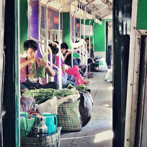 回到仰光,最后补足环城铁路、体验市井生活的环节。3小时的路程,只要1美金,路上好多次查票,因为来来往往上上下下的小贩太多太多。因为是周日,没有了通勤的压力,我们一路有座位,四面透风的车厢,污水沟的酸...回到仰光,最后补足环城铁路、体验市井生活的环节。3小时的路程,只要1美金,路上好多次查票,因为来来往往上上下下的小贩太多太多。因为是周日,没有了通勤的压力,我们一路有座位,四面透风的车厢,污水沟的酸臭、蔬菜的清香、路边水稻的青草味,车上小贩的芒果香,绝对称得上是仰光的视觉、味觉之旅。车上遇到一个拼命追车的小和尚,倾佩他的坚持,我的2017要像他一样努力。共勉!