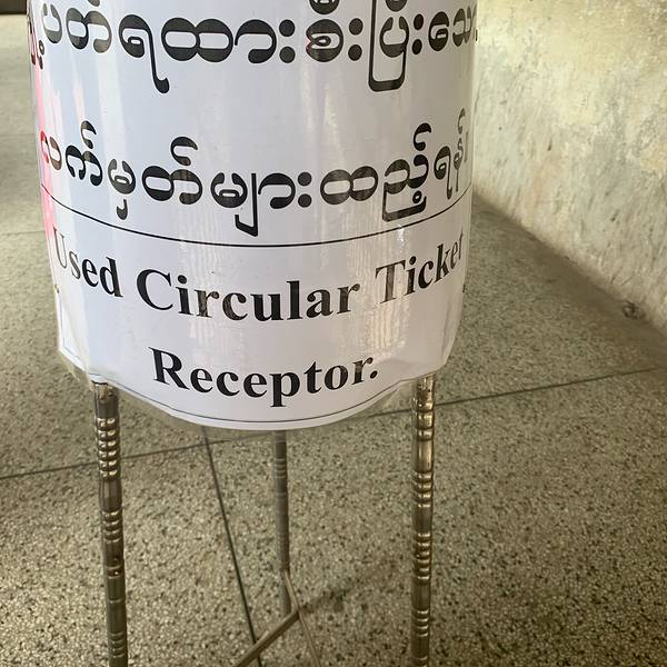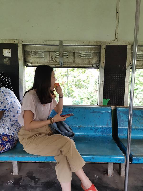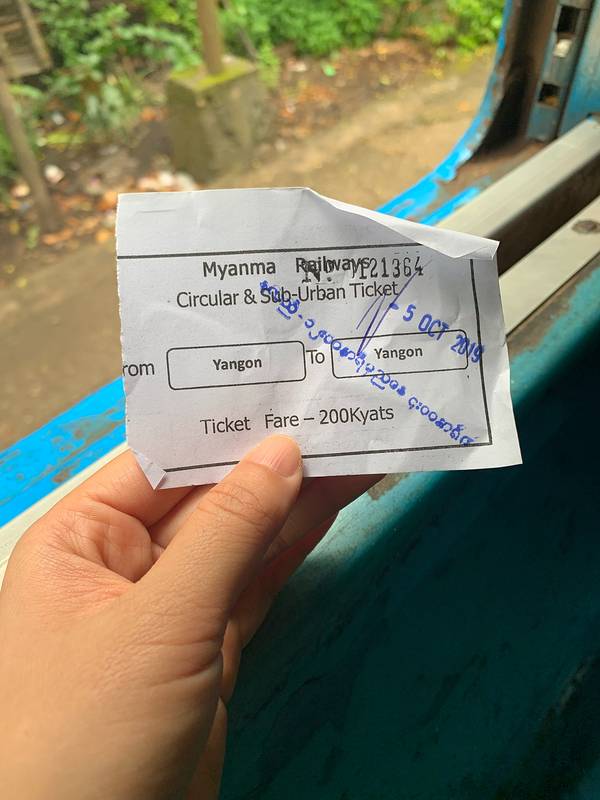 来之前想象中的环城火车是特别破旧的火车,做的感觉不会很舒适,但当你一踏上火车,扑面而来的冷气立刻让你在酷热的缅甸感觉一阵清凉,车厢里同样很干净,不知道是否是早上时间早的缘故,上车的人并不多,还夹杂着一些和我一样专门来体验民情的外国人。重要的还有一点,这列火车环绕仰光城绕一圈的时间是大约3个小时,开的确实很慢,感觉还没有自己骑自行车快,但的确是一个良好的了解当地人和周边生活场所的途径,网上说这个票价是1美元,但我在车站买的票却只有大约300缅币,感觉性价比太高了,如果不赶时间的朋友,推荐来体验一次这列火车。