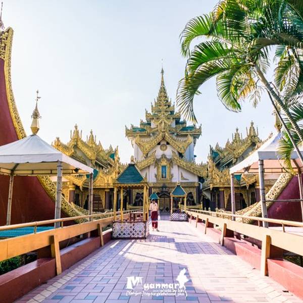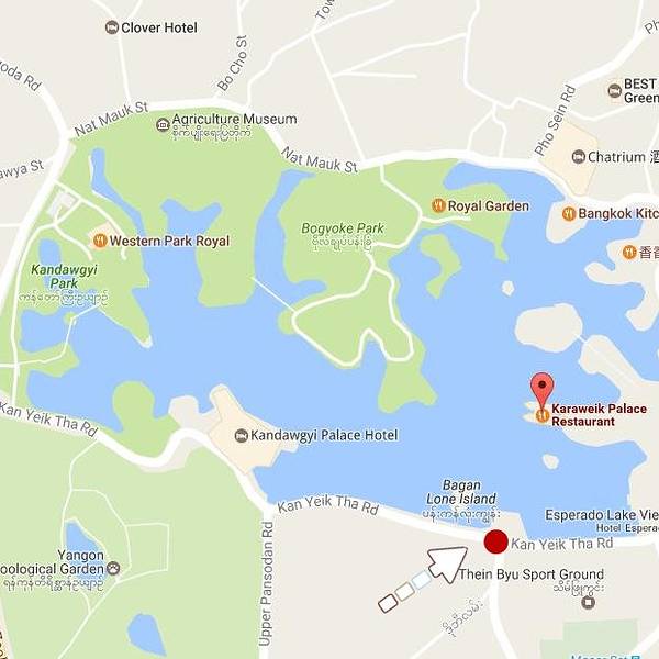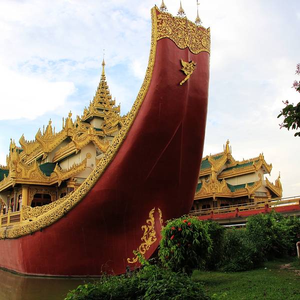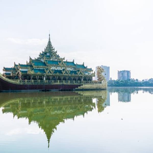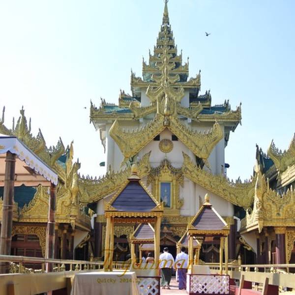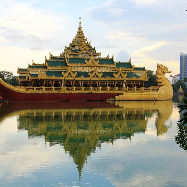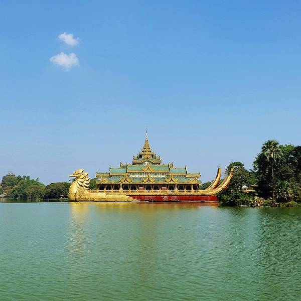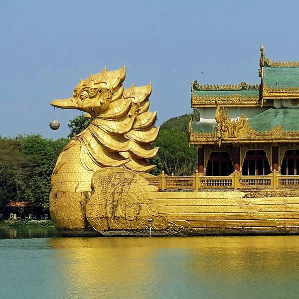 仰光午后的天气让人无法在户外活动 回到酒店 马路边的五星单体楼再从酒店出来 阳光已经不再那么耀眼 但路面依然火烫烫的 卡威尔宫只是正对酒店 过马路环着皇家湖便可抵达卡拉威宫 是缅甸最具特色的皇家鸳鸯船 曾是古代缅甸皇帝御用的水上餐厅造型是传说中的神鸟——妙声鸟 它背驮着一座宝塔 浮游在皇家湖上 因为它的存在 皇家湖又名为卡拉威湖 白天看金碧辉煌 但晚上这里才是歌舞升平 游客可以预订自助晚餐感受一番
