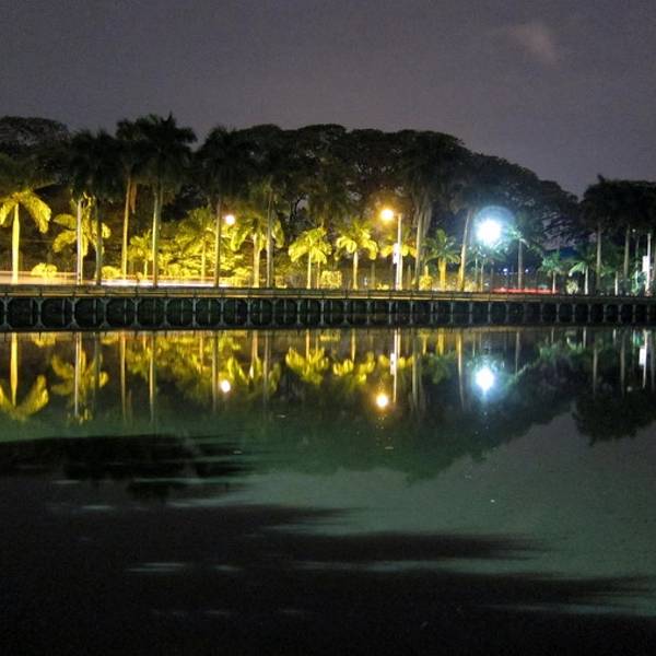 酒壮怂人胆儿。 看着卡拉威宮的灯光煞是好看,脑子一热就想去拍夜景,拎着架子冲下去才发现四周一片黑暗。 仰光的电力供应不很充沛,大街上路灯亮着的找不到几个,听着耳边的车呼啸而过,看着对面的卡拉威宮灯火辉煌,才发现皇家湖公园已经关门进不去了,悻悻然就隔着栏杆支上架子,焦段拧到最长,拍了一张没有妙音鸟鸟头的卡拉威宮。 心满意足,回屋睡觉。