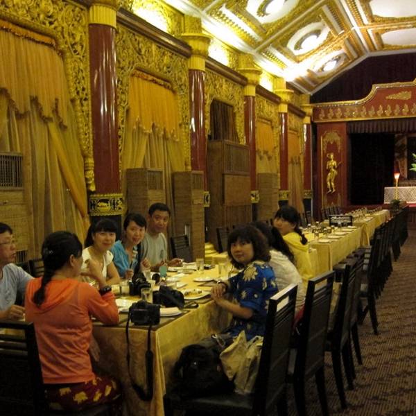 皇家湖上金鸟船形的卡拉威宫其实并不是一座宫殿,而是一个巨大的缅式餐厅,只供应缅式自助晚餐,餐厅中的剧…