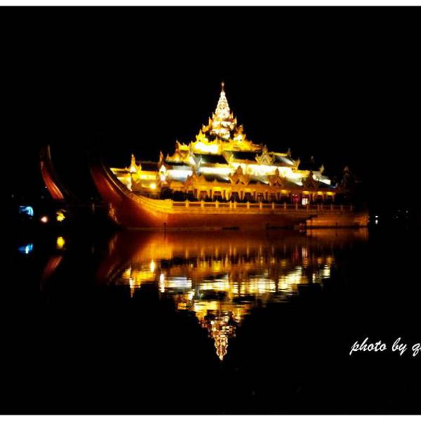 都快天黑了,我打了出租去皇家湖看卡拉威宫。 缅甸的出租都没有表,讲价讲到3000缅元。 卡拉威宫是一座浮于皇家湖上的鸟型大船,是极有特色的仰光标志性建筑。外观金碧辉煌,里面装饰豪华。 卡拉威宫的夜晚灯光璀...