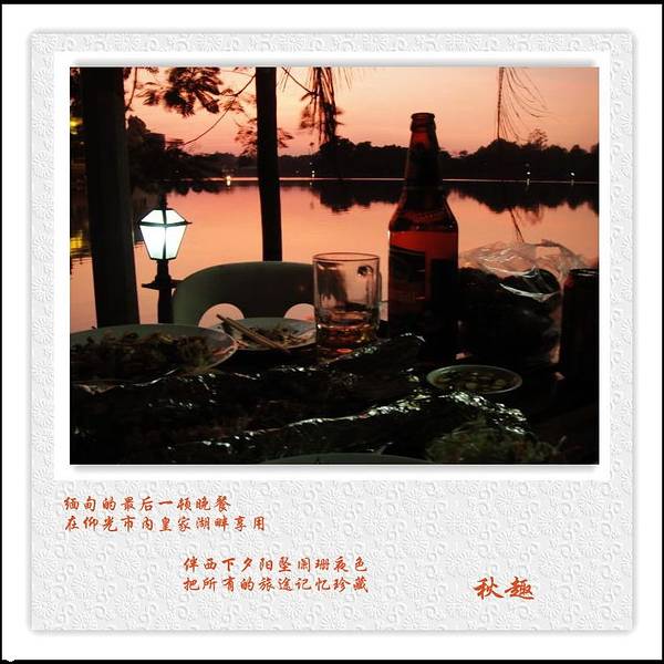 都快天黑了,我打了出租去皇家湖看卡拉威宫。 缅甸的出租都没有表,讲价讲到3000缅元。 卡拉威宫是一座浮于皇家湖上的鸟型大船,是极有特色的仰光标志性建筑。外观金碧辉煌,里面装饰豪华。 卡拉威宫的夜晚灯光璀璨,倒影斑斓。 皇家湖公园门票2000基亚/人。出租车开过了公园门不好调头叫我下车,我下车往湖方向走,有篱笆墙看到有缺口就走了进去,谁知竟然无意的逃了票。 湖区满漂亮的,大家悠闲的散步,情侣一对一对的,天慢慢黑下来,人越来越少,我走着走着迷路了,转不出去,开始害怕起来,看见一位在跑步的小伙子我向他求援,小伙子放弃锻炼带我走出湖区,他说去过北京、上海、杭州。分手时我送了熊猫钥匙链给他作纪念。