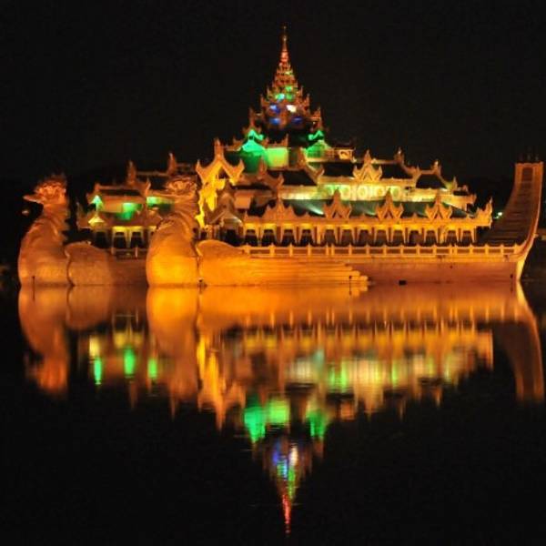 卡拉威宫是一座浮于皇家湖上的鸟型大船,是极有特色的仰光标志性建筑。外观金碧辉煌,里面装饰豪华