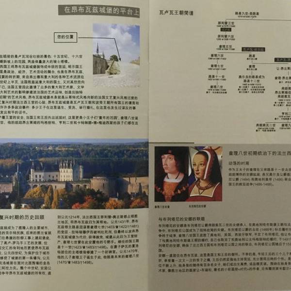 ...,然而在一个普通的日子,他却在前往观看网球比赛的路上,头部装在横梁上,意外身亡,享年才28岁呀昂布瓦斯城堡在卢瓦尔河畔的山巅,在这个水草丰美的地方,城堡就像从山顶生长出来的一样,是这里的一部分。昂布瓦斯城堡是一座历史能够追溯到罗马的战略要塞,在查理八士时期,国王进行重建,这位国王在昂布瓦斯...昂布瓦斯城堡在卢瓦尔河畔的山巅,在这个水草丰美的地方,城堡就像从山顶生长出来的一样,是这里的一部分。昂布瓦斯城堡是一座历史能够追溯到罗马的战略要塞,在查理八士时期,国王进行重建,这位国王在昂布瓦斯城堡里一住就是六年,然而在一个普通的日子,他却在前往观看网球比赛的路上,头部装在横梁上,意外身亡,享年才28岁呀!在他之后弗朗索瓦一世接替了城堡的所有权,他在这里度过了不少日子,出于对意大利文艺复兴时期的浓厚兴趣,他把科学和艺术领域的伟大奇才,我们熟知的达芬奇大人,从佛罗伦萨请到了这里。达芬奇在这里度过了他的晚年,最后也埋骨于此。 在买票的地方有讲解器,价格貌似是4欧元一台,一定要租 展开