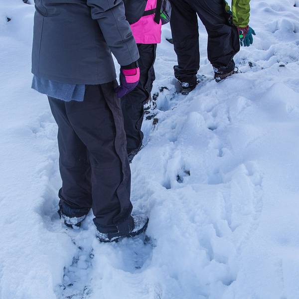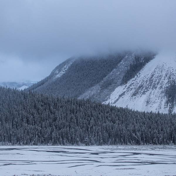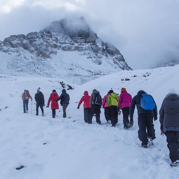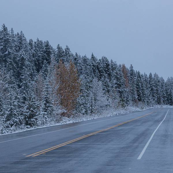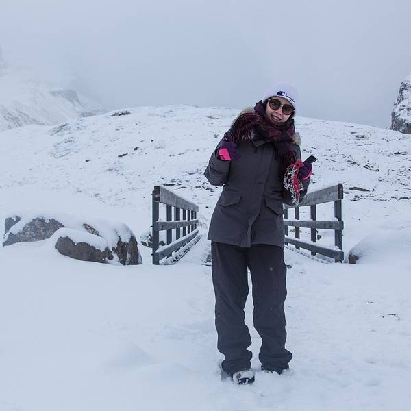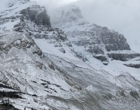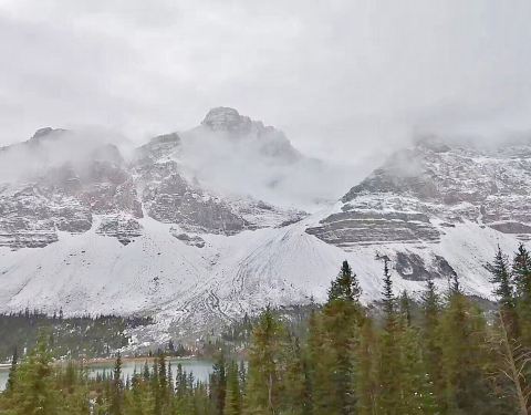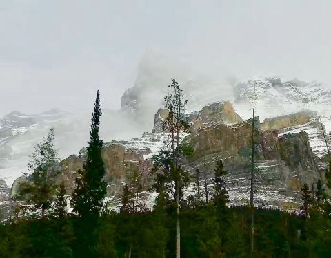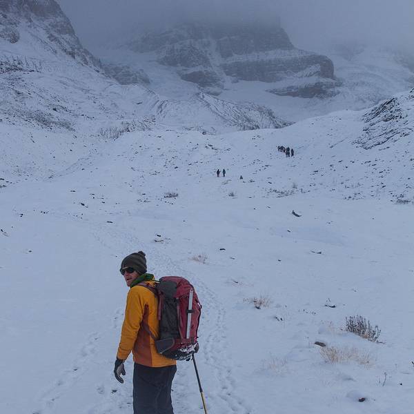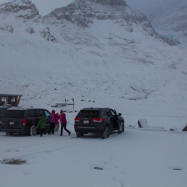 只不过徒步的出发点位置有些尴尬,位于之前经过的冰原中心附近,而且出发时间是早上9点,所以只好早起,提前一个小时从贾斯珀出发前往冰原中心。又是一整晚的大雪,冰原大道两侧变成了黑白色的世界,早上8点的冰原大道几乎连车都没有,有种静寂的美。提前20分钟到达,集合的地点位于冰原中心对面,距离冰川最近的停车场。这时候天气简直糟糕到不行,阵阵的风不断吹动着雪花,周围什么都看不见。哥伦比亚冰川徒步和坐大脚车的徒步不太一样,是由领队带领,从冰川脚下直接徒步到冰川上,整个徒步往返大概2个多小时的时间。