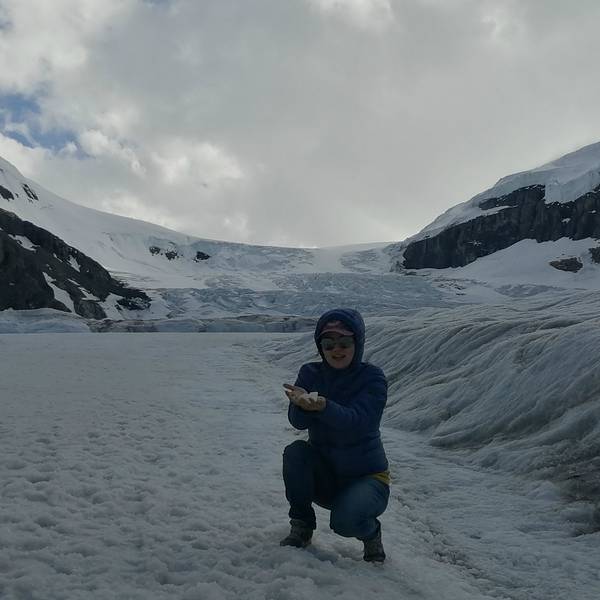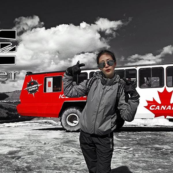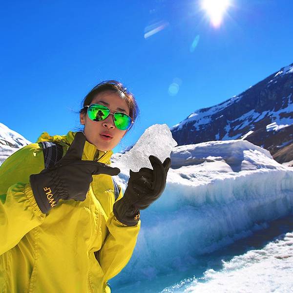 这是一个非常非常棒,非常让人惊艳,也必须要来的景点。我十分推荐来加拿大游玩的朋友们要来参加这个冰川项目。夏季,你可以加入落基山脉的探索发现之旅(Rockies Discovery Sightseeing Tour),不管你是从露易丝湖出发,还是从贾斯珀出发都可以,每年的起止时间稍微有些不同。如果你喜欢从南往北游玩,像我一样,那就是参加从露易丝湖出发的探索之旅,今年是从5月1号开始,10月10号结束;如果你喜欢从北往南走,也就是从贾斯珀出发,今年是从5月3号开始,10月18号结束。冬季当然也有另外合适的套餐咯,从10月19日开始到次年的4月30日,是冬季的项目哈。感恩游玩当天的好天气,阳光明媚心情棒棒的,我们在宾客中心享用了还不错的自助午餐,然后换成了景区特定的冰原车,前往哥伦比亚冰原。冰原车有超级大的轮胎,非常适合行走在冰原地区,据说造价是100万美金一辆车哦,景区大概有20辆在用的冰原车,冰原车外观有好几种,反正我都觉得很酷。司机兼任讲解员和导游,一路上都在讲解哥伦比亚冰原的历史,由来以及特色。经过大概10分钟的车程,我们的双脚踏在了这片神奇的冰原上。冰原面积500平方公里(200平方哩),由冰盖和十几处冰川组成。阳光下的冰原很耀眼,弯腰细看,冰面上都在冒烟,断层处你能看到哗啦啦的冰川融水,捡一块冰来拍照才发现非常非常的冰冷啊,拿在手里才一会儿,手就冻僵了。