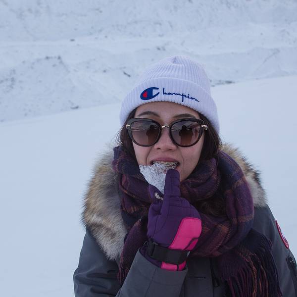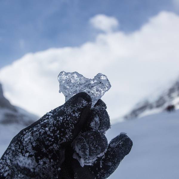 就算自己没有装备也没关系,领队会带着全身全套的装备过来,从帽子,外套,防雪裤和雪鞋,装备非常齐全,如果有没带或不合适的可以借用。唯一需要自己准备的是墨镜,在冰川上长时间行走,如果不带墨镜的话真的会有轻微的雪盲状况发生。领队是澳大利亚人,秋季开始来班夫做徒步的领队,跟我们说今天的这次徒步是今年最后一场,之后就会因为天气的情况关闭了,还挺幸运。一个小队10个人左右,沿着领队踩下的脚印逐个前进,领队也会不时停下和我们讲解冰川的构成和其他冰川的知识。走到一半,终于太阳出来了!之前已经快两天没见到太阳,没想到徒步之后又是连续几天见不到。看起来是走在积雪上,其实下面都是厚厚的冰川,等从一开始的石头地面走到冰川上,领队就会要求大家把冰爪套在鞋底。从冰川上砸下来的冰块,看着很普通的冰块,其实已经有300岁了。路边会经过深不见底的冰洞,之前我们去伊朗的时候找一个藏冰的洞,小胖上来就问旁边当地人where is the icehole,幸亏那人没听懂吓死我了,这次千叮咛万嘱咐千万别再这么说,那叫ice cave...如果说普通的徒步可以欣赏美景,哥伦比亚冰川徒步加分的地方在于冰川独特的景色,并且还可以从中学习到一些冰川的知识。比如谁知道为什么看冰川是淡淡的蓝色?