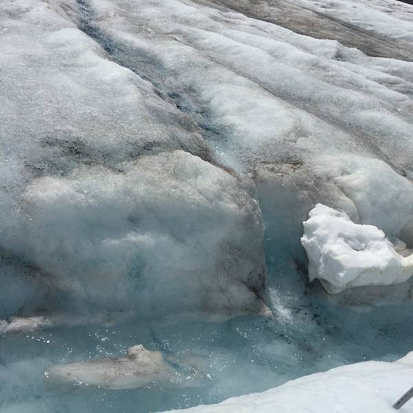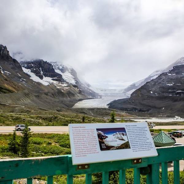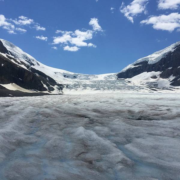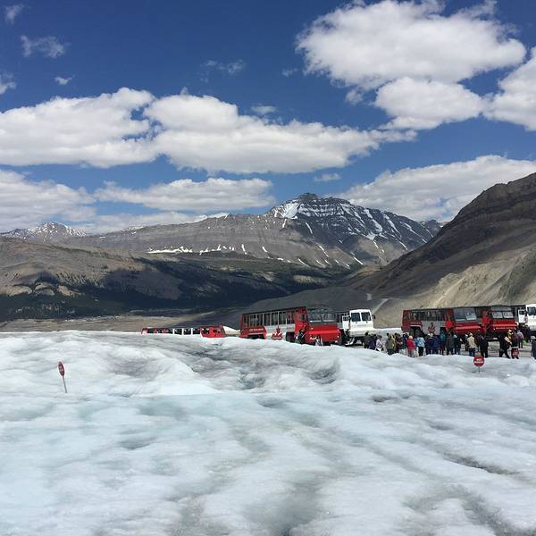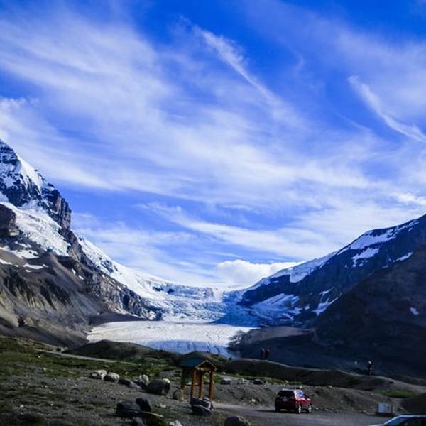 阿萨巴斯卡冰河长达7公里,一年的移动距离大约只有七米,所以冰雪要从冰原流到冰河的下端可能要数百年,甚至上千年。而阿萨巴斯卡冰川冰雪至少已经堆积了8000年,它像是从哥伦比亚冰原伸向人们的指头。地球的温室效应使这条冰川在80多年间后退了1.5公里,它如今得以保存有赖于此地丰富的降雪——平均降雪量每年七米。站在寒气逼人的冰川上可看到冰雪环抱的地貌中,巍峨的山峰在这盛夏季节依然头顶白雪,腰缠云雾。向冰川上游远望,可看见糖霜般的冰原边缘部分,更可清晰看到滚动状的凝滞冰瀑。夏天,游客可以乘坐大巴在冰川上观光。