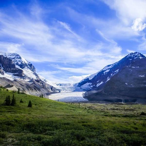 阿萨巴斯卡冰河位于班夫国家公园,发源于哥伦比亚冰原,巍峨的山峰在盛夏季节依然头顶白雪,腰缠云雾。