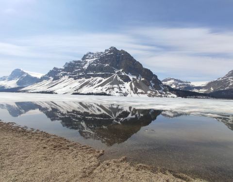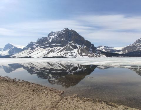 五月底到班夫国家公园的弓湖确实是为时太早了,因为湖面的冰只化了湖边一点点五月底到班夫国家公园的弓湖确实是为时太早了,因为湖面的冰只化了湖边一点点。想拍一个湖水里雪山倒影恨不得趴在地上。也正因为这一点,去弓湖的游人也沒几个。拍几张照,湖边走几步就草草了事了。