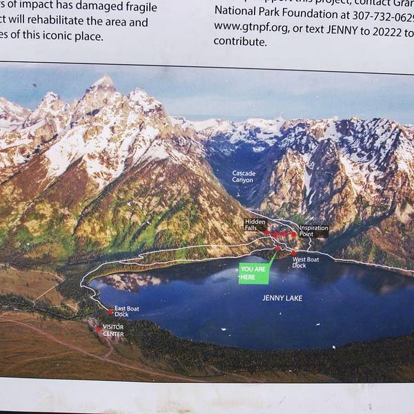 2)先乘船游湖到对岸(每年六月到九月早8:00至晚6:00有往返的小船到湖对面,几十个座位,单程7刀/人,往返10刀/人),十几分钟的航程,一下船就是Jenny Lake Trail的起点,6 miles,途经Hidden Falls抵达Inspiration Point,在那里可以俯瞰整个Jenny Lake。继续走再走远一点可以到Cascade Canyon。当然也可以选择不乘船而是绕著湖边走到湖对岸,然后再走这个Trail。