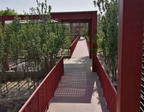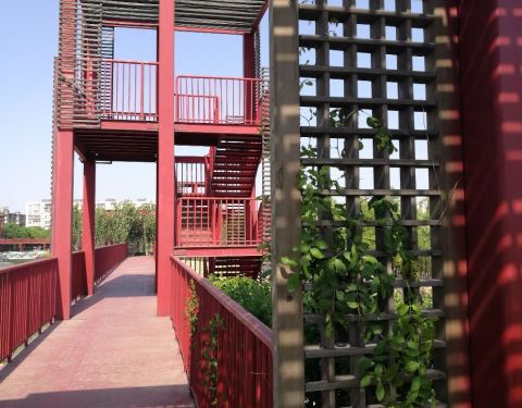 【桥园公园】 免费公园,地处天津市区正东,在卫国道之南,快速路河东段之东,形成的一个扇面形的夹角,公园的两个边在盘山道和天山路上,交汇处的夹角就是公园的正门,对着万新公交站。 进入公园,不远是一个下沉的花园,开放的绿地间有可以休息的木质座椅,绿地旁边用厚厚的铁板围成的台基,一共是四层高,台基下面是石头围墙,台基上面种植着各种植物。 巨大钢铁台基的顶部,是一个三层的方形铁塔,第一层的铁塔上面有一座铁桥,连接着另一座台基和铁塔。 走上铁塔的最高层,已经感到了高处的风很大,整个桥园尽收眼底,放眼望去,向西横向有四五座这样的铁塔,向北的铁塔更多,中间被铁桥连接,像一座长城,几乎一眼望不到头。 我被眼前巨大的建筑群所震撼,这完全是一座具有后现代风格的创意园林,这创意和规模太宏伟了,它把天津这座曾经的重工业城市,演变为一座由海河和无数桥梁组成的美丽的城市,完美的表现了出来。 对面一座漂亮的湖泊映入眼帘,湖中的芦苇随风摇荡,湖中的野鸭子追逐和飞翔着,第一次看到会飞的鸭子。湖泊对面一排长廊后面,是更多的树木和绿地,最远处是卫国道的高架桥。 从铁塔下到地面,穿过一条铁桥,来到湖泊的对面,芦苇荡发出清新的芳香。顺着芦苇荡边的湖边长廊,来到水禽栖息的地方,雪白的白天鹅骄傲的看着游人,不屑一顾他们扔过去的食物,好像对他们说,禁止投喂食物的牌子,你们没看到吗。 一座巨大的现代建筑是公园的核心,一座铁桥直通公园正门,反方向进入树木茂密的公园深处,一座座形态各异的铁艺雕塑,矗立在草地的中央,公园更深处还有一座座小木桥,连接着一个个很小的水泡,这个名字很有意思,就是很小很小的沼泽湖泊。 从东边的一排台基铁桥往回走,沿路种植着漂亮的月季花,月季是天津的市花,每年的五月,都会开遍天津的各各花园和街道的绿化带上,非常的鲜艳夺目。 走到前门,才看到桥园公园的介绍,这座湿地公园建于2008年,2009年在巴塞罗那国际建筑节上,获得了世界最佳景观奖,在中国城市公园中的第一次获此殊荣,做为天津人,真是无比的荣幸!