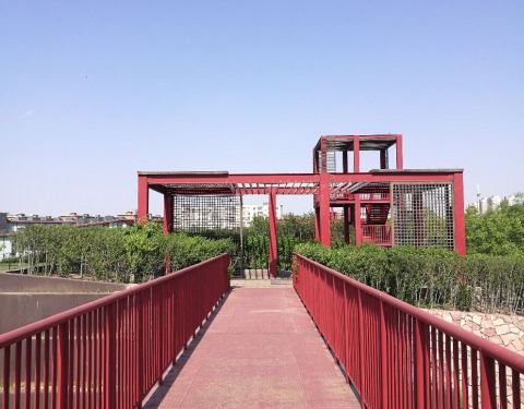 我被眼前巨大的建筑群所震撼,这完全是一座具有后现代风格的创意园林,这创意和规模太宏伟了,它把...【桥园公园】 免费公园,地处天津市区正东,在卫国道之南,快速路河东段之东,形成的一个扇面形的夹角,公园的两个边在盘山道和天山路上,交汇处的夹角就是公园的正门,对着万新公交站。 进入公园,不远是一个...【桥园公园】 免费公园,地处天津市区正东,在卫国道之南,快速路河东段之东,形成的一个扇面形的夹角,公园的两个边在盘山道和天山路上,交汇处的夹角就是公园的正门,对着万新公交站。 进入公园,不远是一个下沉的花园,开放的绿地间有可以休息的木质座椅,绿地旁边用厚厚的铁板围成的台基,一共是四层高,台基下面是石头围墙,台基上面种植着各种植物。 巨大钢铁台基的顶部,是一个三层的方形铁塔,第一层的铁塔上面有一座铁桥,连接着另一座台基和铁塔。 走上铁塔的最高层,已经感到了高处的风很大,整个桥园尽收眼底,放眼望去,向西横向有四五座这样的铁塔,向北的铁塔更多,中间被铁桥连接,像一座长城,几乎一眼望不到头。 我被眼前巨大的建筑群所震撼,这完全是一座具有后现代风格的创意园林,这创意和规模太宏伟了,它把天津这座曾经的重工业城市,演变为一座由海河和无数桥梁组成的美丽的城市,完美的表现了出来。 对面一座漂亮的湖泊映入眼帘,湖中的芦苇随风摇荡,湖中的野鸭子追逐和飞翔着,第一次看到会飞的鸭子。湖泊对面一排长廊后面,是更多的树木和绿地,最远处是卫国道的高架桥。 从铁塔下到地面,穿过一条铁桥,来到湖泊的对面,芦苇荡发出清新的芳香。顺着芦苇荡边的湖边长廊,来到水禽栖息的地方,雪白的白天鹅骄傲的看着游人,不屑一顾他们扔过去的食物,好像对他们说,禁止投喂食物的牌子,你们没看到吗。 一座巨大的现代建筑是公园的核心,一座铁桥直通公园正门,反方向进入树木茂密的公园深处,一座座形态各异的铁艺雕塑,矗立在草地的中央,公园更深处还有一座座小木桥,连接着一个个很小的水泡,这个名字很有意思,就是很小很小的沼泽湖泊。 从东边的一排台基铁桥往回走,沿路种植着漂亮的月季花,月季是天津的市花,每年的五月,都会开遍天津的各各花园和街道的绿化带上,非常的鲜艳夺目。 走到前门,才看到桥园公园的介绍,这座湿地公园建于2008年,2009年在巴塞罗那国际建筑节上,获得了世界最佳景观奖,在中国城市公园中的第一次获此殊荣,做为天津人,真是无比的荣幸! 展开