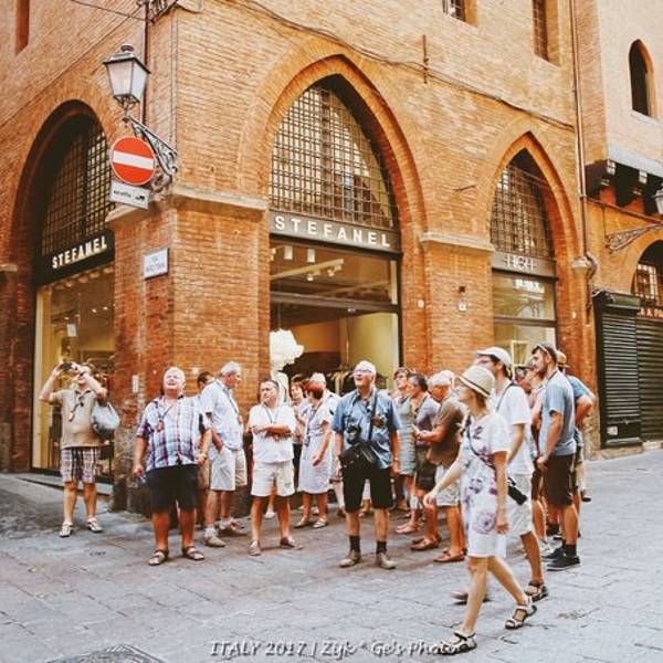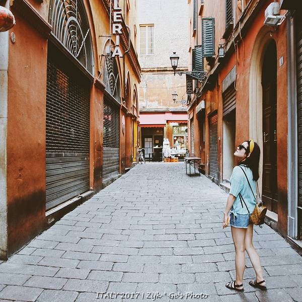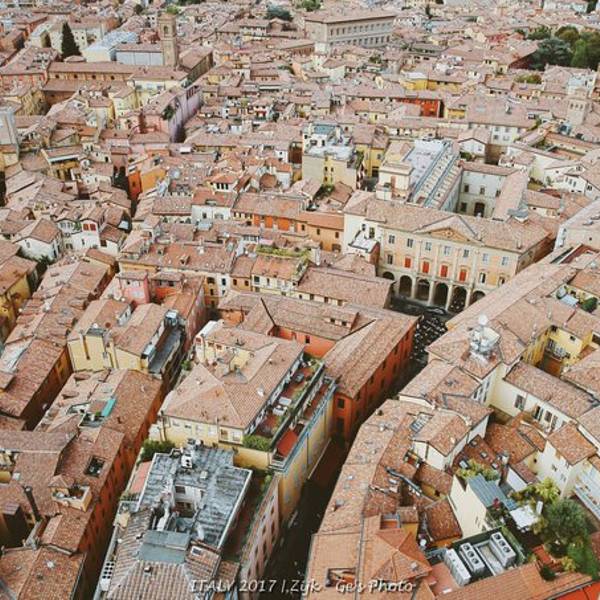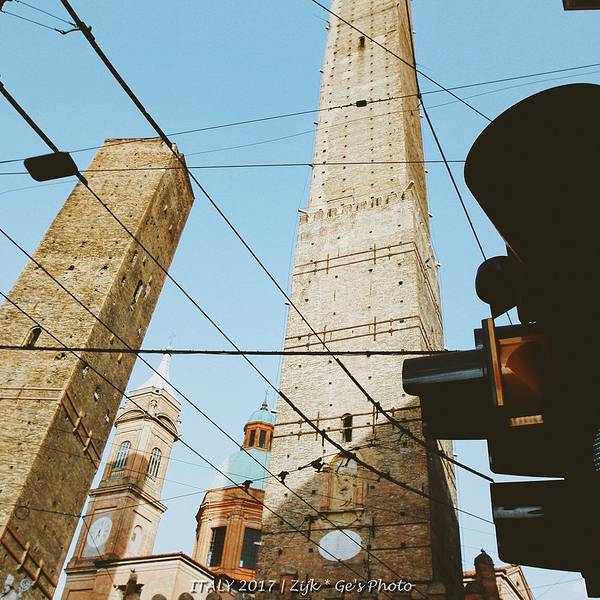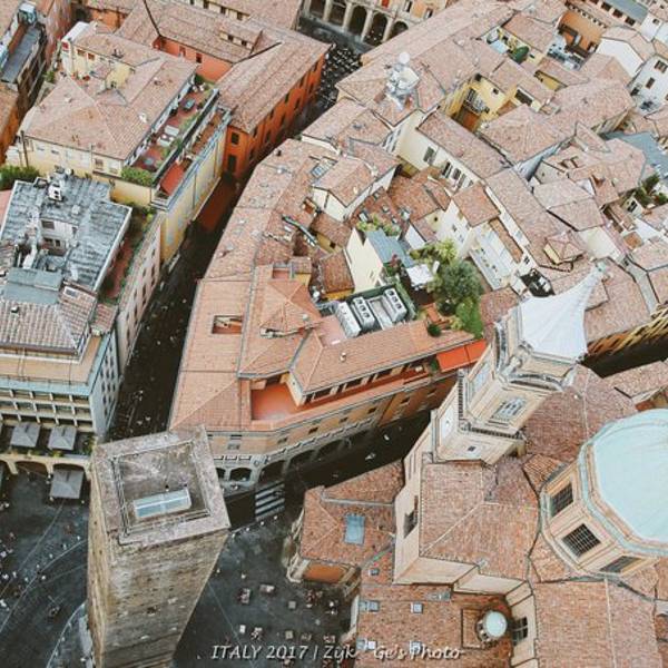 市中心主广场的圣白托略大殿(Basilica di San Petronio)是博洛尼亚的主要教堂,虽然不是主座教堂,但是整个建筑非常有特点,是世界第5大教堂。夜晚的市中心广场,人非常的多。白天气温30几度比较高,晚上凉快了大家都出来散步闲逛了。博洛尼亚也叫做“塔之城”,历史上这座城市曾经有超过180座高塔,至今可见的还有十多座。最高的Asinelli塔高达91米,就是下图这个,它的身边站着虽然只有48米但是明显倾斜的 Garisenda 塔。二者的组合成为这座城市的标志性景观。近看就是这两座塔楼了,我们登顶了最高的那个,门票挺便宜的,不过要预约时间,每次只能上去固定的人数,另外这种全程都要爬非常窄小的楼梯。登到顶的景色还真的不错,能俯瞰整个小城,不愧为一座中世纪城市,基本看不到什么现代化的建筑。下边就是另一个只有48米但是明显倾斜的 Garisenda 塔啦~在这个小城呆了将近一周的时间,基本转遍了各个角落,真的是一个非常适合居住的地方。相机没有拍到的东西太多太多,这个非主流旅游城市的小镇,给我的好印象超过了久负盛名的威尼斯,是一个很值得慢慢体会的小城市。