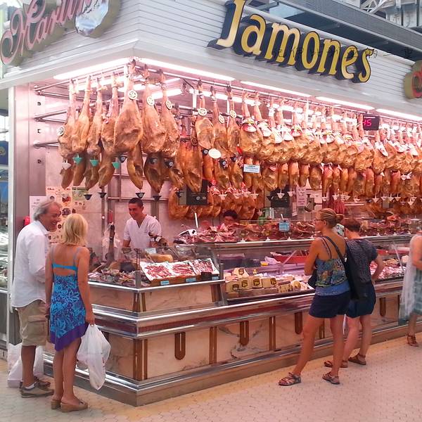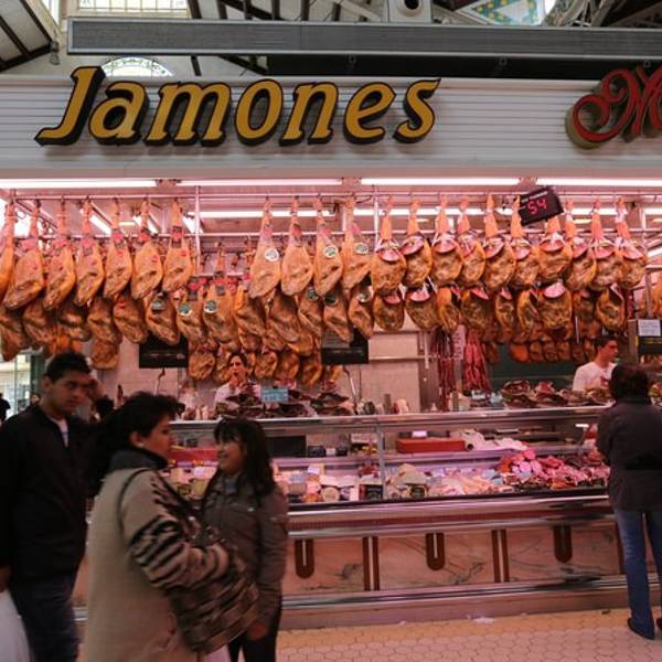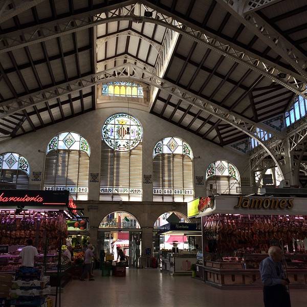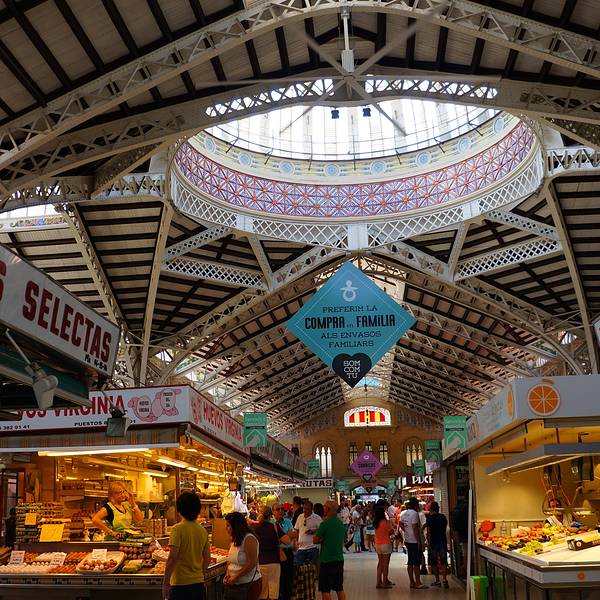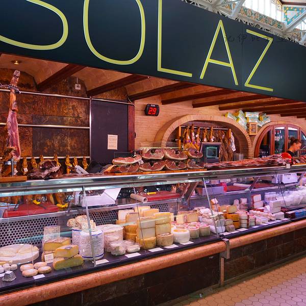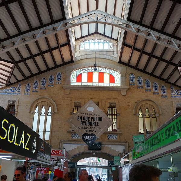 中央市场是瓦伦西亚最美的现代主义建筑,欧洲最大规模的市场之一,1914年设计建设,花了14年时间修建,1928年落成。建筑是以钢铁和彩色玻璃,辅以彩色瓷砖建造而成,采用从玻璃圆顶透进的自然光,让整个市场明亮而温暖。从入口处的高大拱门走进去,1300多个摊位聚于这8000平方米的市场中,包括各种新鲜蔬菜水果、芝士、火腿、香料等食材,还有很多海鲜、饼干面包坊,烹煮西班牙海鲜炖饭的厨房用具,如果逛得饥肠辘辘,这里还有供应熟食的店家,可以买了马上品尝。市场绝对值得花时间好好逛逛,体验这种最本土的温暖热烈的西班牙市井气息,不妨与摊主交流一下,尝尝新鲜的橄榄油,不过不要忘了抬头欣赏一下圆形顶的华丽装饰。 在这里最值得购买的包括橄榄油、红酒和火腿。作为葡萄酒最大产地之一的西班牙,平时很少被我们关注,这跟它缺乏宣传以及本身的葡萄酒发展历程有关。西班牙的葡萄酒以红酒为主,也有相当出色的白葡萄酒和汽泡酒CAVA,其中,雪莉酒曾经被莎士比亚赞美为“装在瓶子里的西班牙阳光”。不过,名酒雪莉酒和卡瓦酒以传统方法酿制,基本上只在西班牙国内能买到。