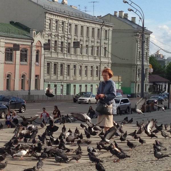 图书馆前喂鸽子的女人,雕像头上的鸽子,还有街旁的鲜花。