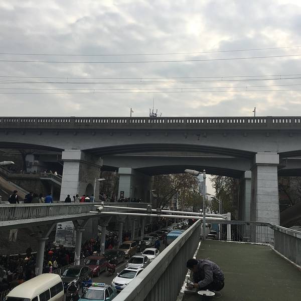 明明有电梯,我们两个傻姑娘居然没有看到,傻傻的走了一段很长很长的引桥才上到桥面一直很好奇,武汉有这么多的鸭肠子吗?每个门口都是一桶巨大的竹签