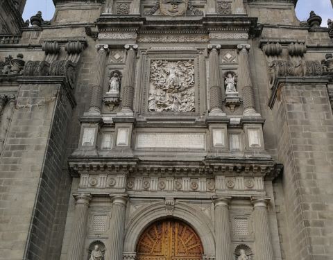 墨西哥城主教座堂位于宪法广场北侧,是拉丁美洲规模较大且历史悠久的天主教堂。教堂由西班牙人在1573年开始修建,至1813年方完全竣工,历时250年完。漫长的修建时间使大教堂包含了古典巴洛克、新古典等多种建筑风格。 该建筑主体由两侧高耸的钟楼和中间宽广的主殿构成,其中钟楼高达67米,主殿宽为110米。教堂中除了保存在16个礼拜堂中古老的雕像和家具以外,其引人注目的就是顶上那辉煌艳丽的圣经故事壁画。圣器藏品室内墙上有殖民时期大画家Correa的彩色壁画。据说,大教堂所在地就是天主教很大教区的中心。