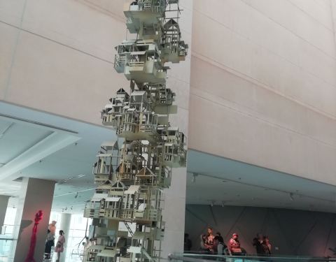 作为一个没有多少艺术细胞的人,对于美术馆的建筑不知道如何来评价,只能说给人的感觉是十分的高大上,正门外是一个锡做的有很多孔的一个大球,球上又有很多个圆珠子镶在上面,很多游客在这里拍照;后面就是二十多根圆柱,撑着一个半圆屋顶,屋顶后面是一个整体看上去正方体形状的主建筑;通过圆柱就到了大门口,通过安检才能进入到大厅之中,安检得十分严格,杯子里的水都必须检测,也算是保护艺术的一种方法;大厅里有一副很大的画,据说是出自国外某某知名大师之手,反正在我看来没什么感觉,馆内共有4层楼,每层楼都有独立的展厅,里面有很多画,还有一些艺术品,很有观赏性,不过出于对艺术的尊重,就没有一一拍摄。 展开