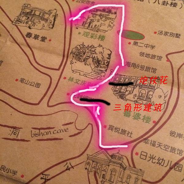 具体是:三一堂靠笔山洞方向,不进笔山洞,走洞右侧的上坡小路,一只直走,经过三角形建筑路口,右转进炮仗花那里,然后一直顺着路走到尽头前有个左拐的上楼梯小巷子,上去左手边就是观彩楼了,观彩楼对面就是春草堂。