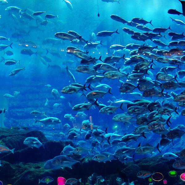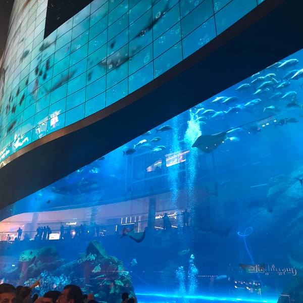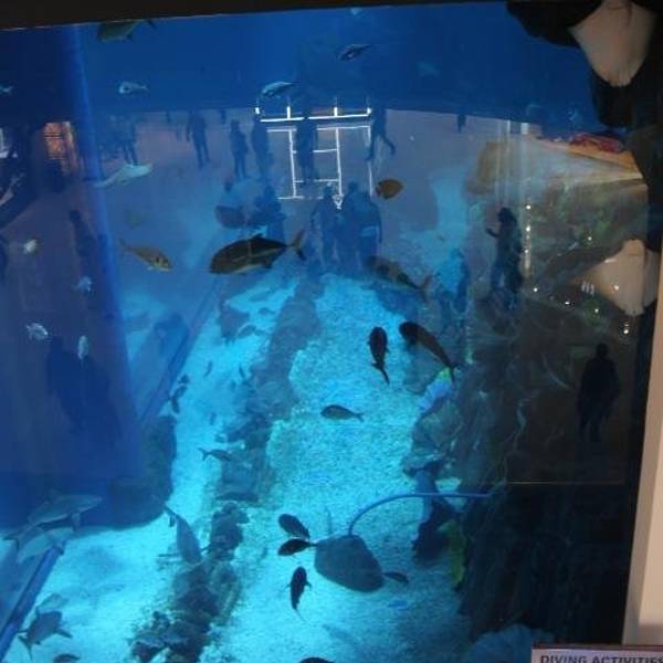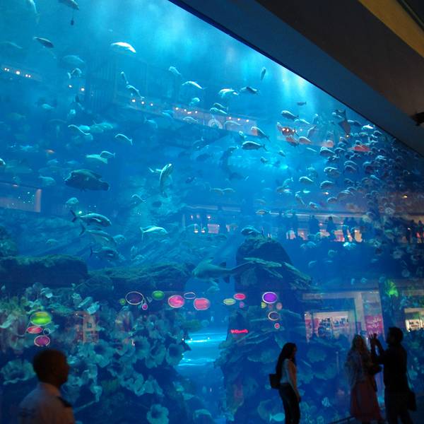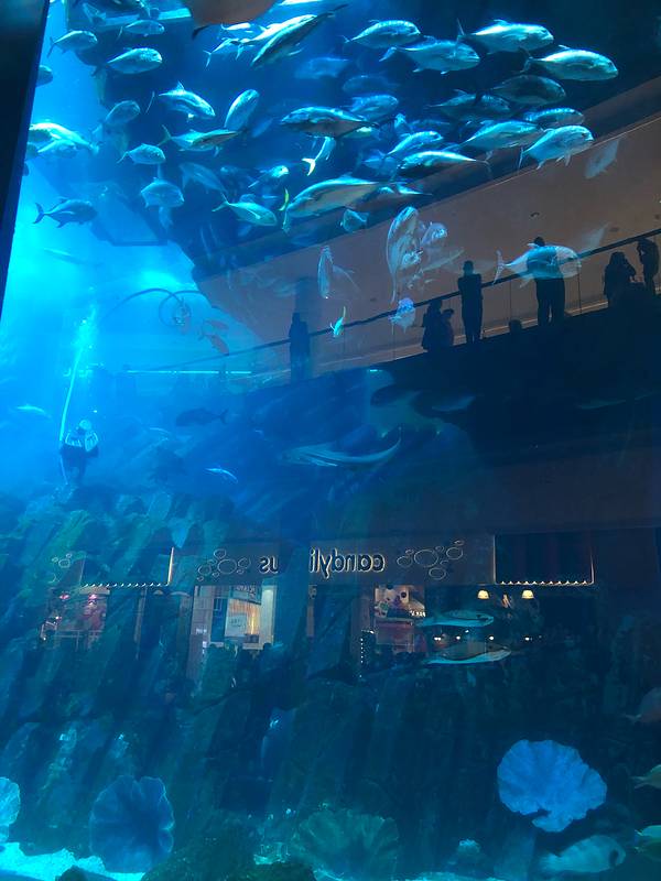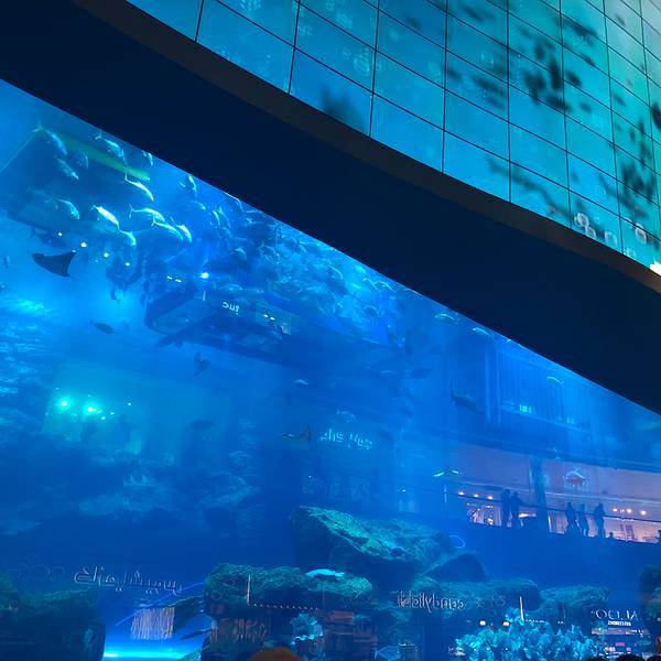 迪拜购物中心有一个让人久久不愿意离开的景点,就是那个巨大的水族箱,大到让人无法想象,怎么可以有这么大一个“鱼缸”呢?一般的鱼缸能养得都是小鱼,海洋公园或者海底世界之类的公园里面的玻璃水族箱也就一两...迪拜购物中心有一个让人久久不愿意离开的景点,就是那个巨大的水族箱,大到让人无法想象,怎么可以有这么大一个“鱼缸”呢?一般的鱼缸能养得都是小鱼,海洋公园或者海底世界之类的公园里面的玻璃水族箱也就一两层楼的高度,迪拜购物中心的水族箱,足足有3层多的楼层高度,里面养着的是虎鲨、海洋大鱼群,非常壮观的,里面的鱼而且是相处和谐,真是太美了!看的水族的时间可以安排在登迪拜塔看日落之前,或者看完迪拜喷泉的间隙在这里看,看完就去看下一场的音乐喷泉,当然也可以在对着这个巨型水族箱的那一列餐厅里面用餐,在餐厅里面有些位置就可以一边用餐一边看鲨鱼在水里威武了,哈哈!