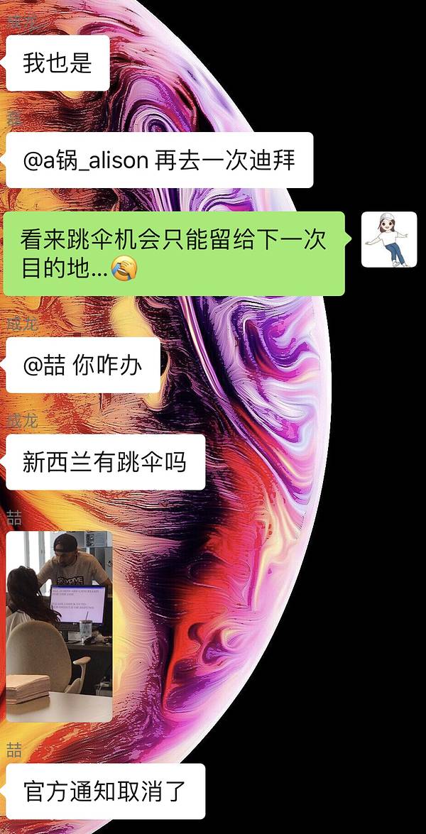 接着就看到手机微信群里在 迪拜 或者马上要来 迪拜 的旅友们在焦急讨论着“今天跳伞会取消吗?”“早上沙漠跳伞全部被取消了,祝各位好运”